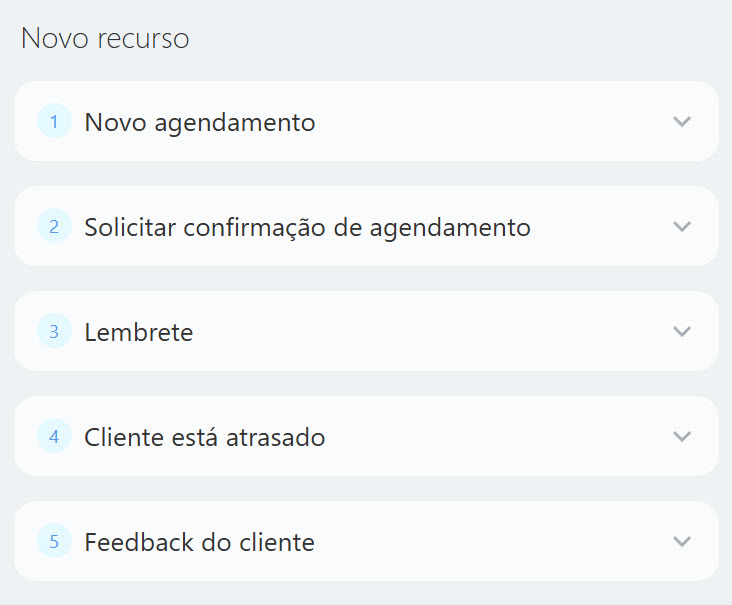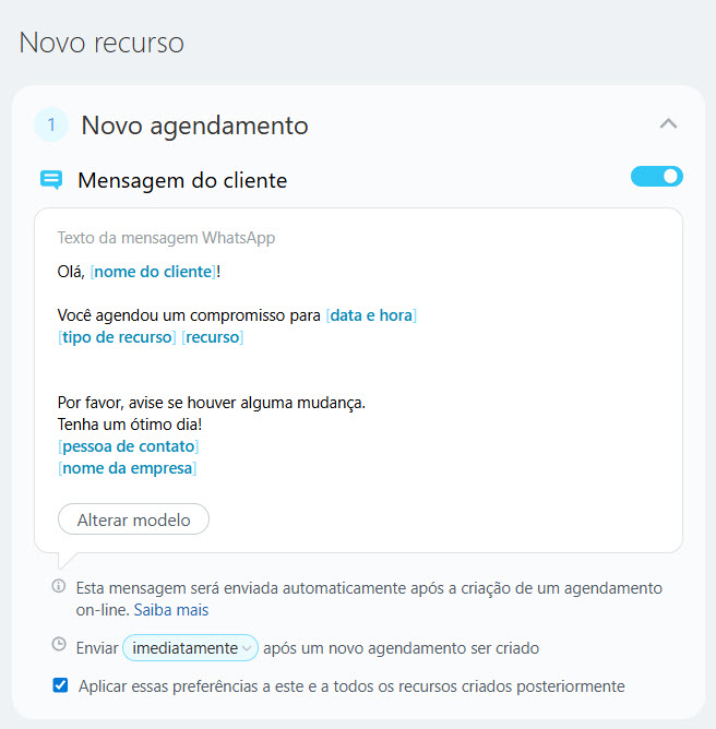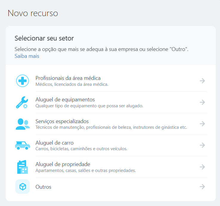 Acesse a seção "Agendamento", clique em "Adicionar um recurso" e selecione o campo de atividade da sua empresa. O sistema ajustará automaticamente as configurações do recurso, disponibilizando o tipo adequado e modelos de mensagens, como para agendamento de especialistas ou equipamentos.