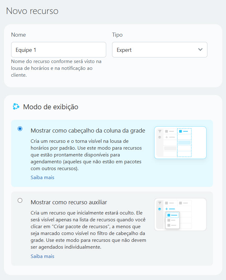 Informe o nome e o tipo do recurso. Você pode selecionar um tipo da lista ou criar o seu próprio. Essas informações aparecerão no painel de agendamento e serão incluídas nas mensagens enviadas aos clientes.