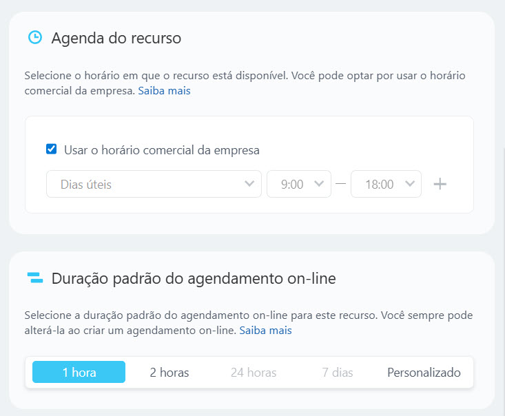 Defina o horário de funcionamento e especifique quando o recurso estará disponível para agendamento. Aplique o horário comercial padrão da empresa ou defina um horário personalizado. Você pode configurar a disponibilidade de forma flexível para cada dia da semana.