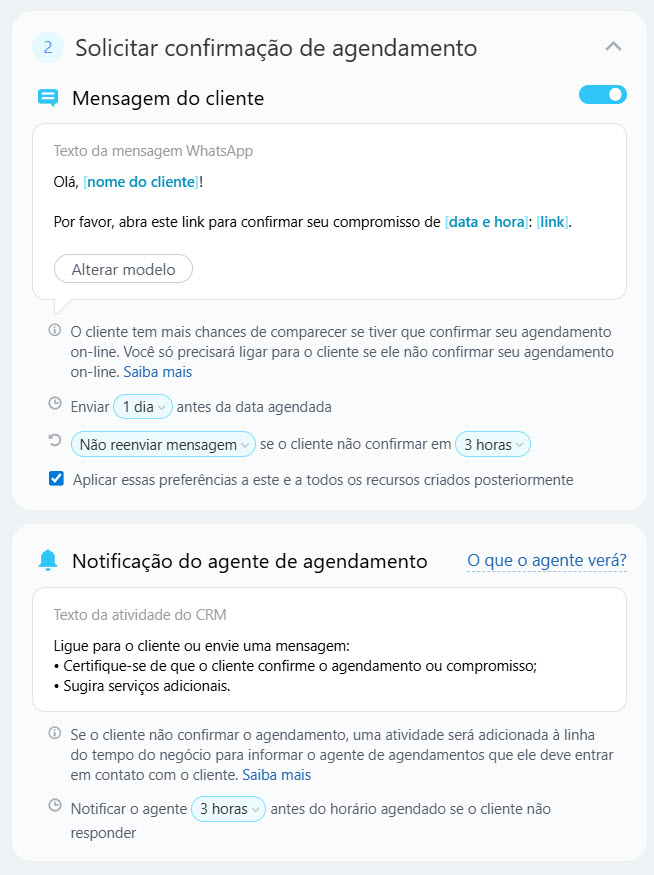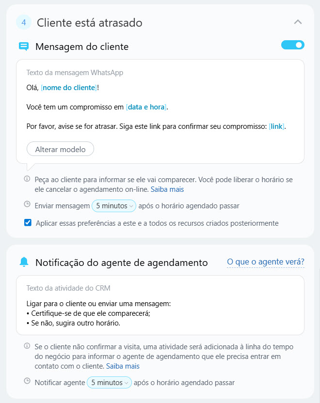 Nas mensagens "Solicitar confirmação de agendamento" e "Cliente está atrasado", é possível configurar notificações para os agentes caso o cliente não tenha confirmado o agendamento ou esteja atrasado.