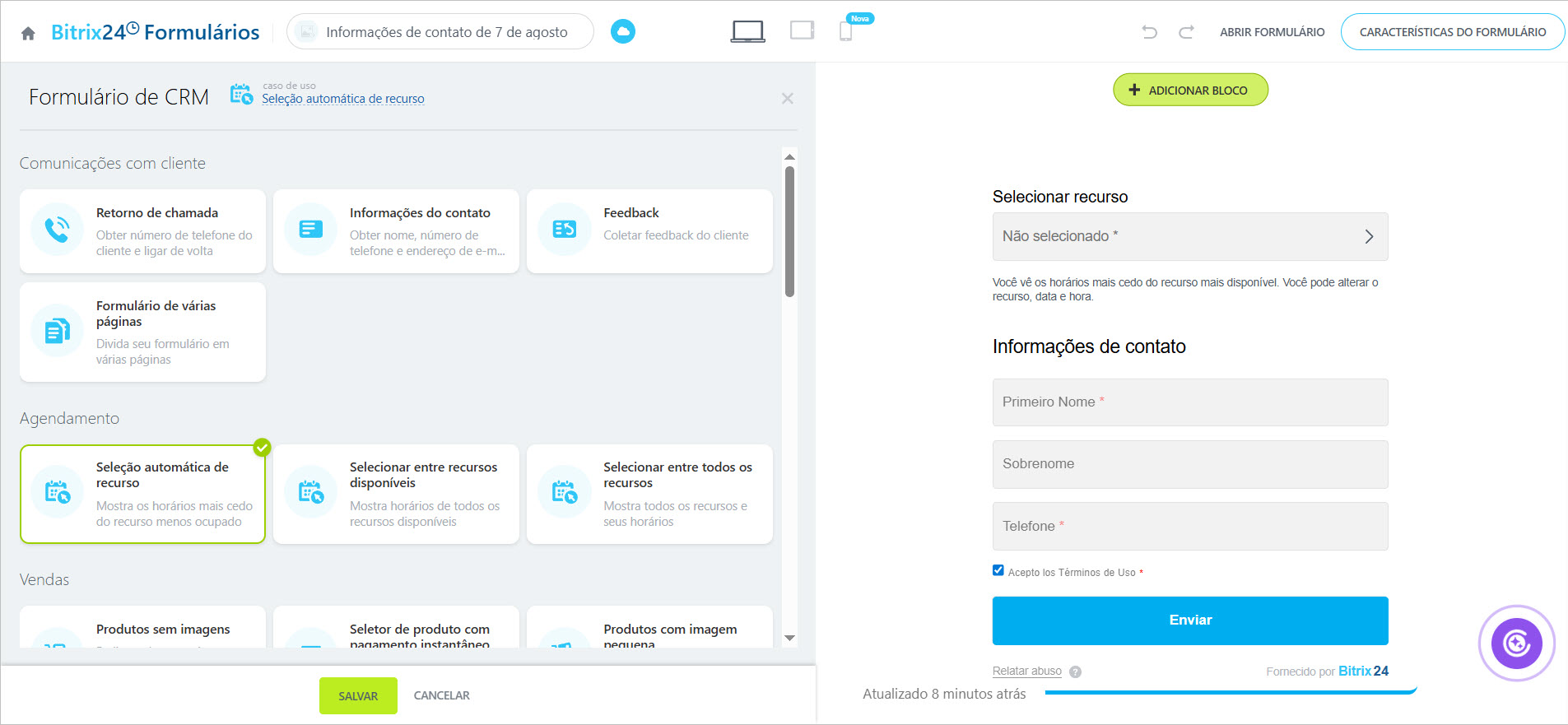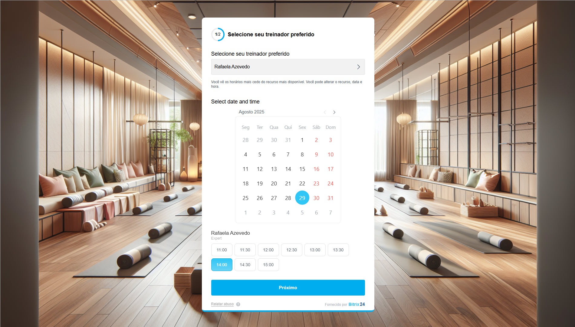 Configure um formulário de CRM que facilite o agendamento de serviços pelos seus clientes. Eles poderão ver os horários disponíveis e agendar com apenas alguns cliques, sem a necessidade de assistência da equipe.