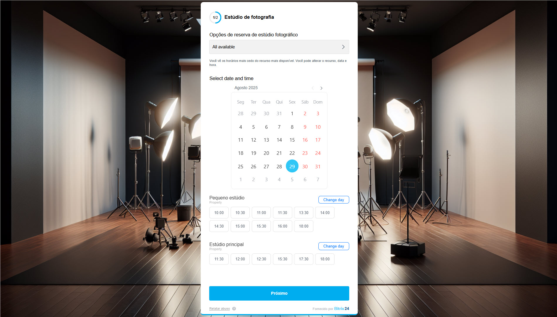 Os clientes podem selecionar o recurso, a data e o horário de forma independente. Isso é ideal quando é importante reservar não apenas um horário, mas também um especialista ou equipamento específico.