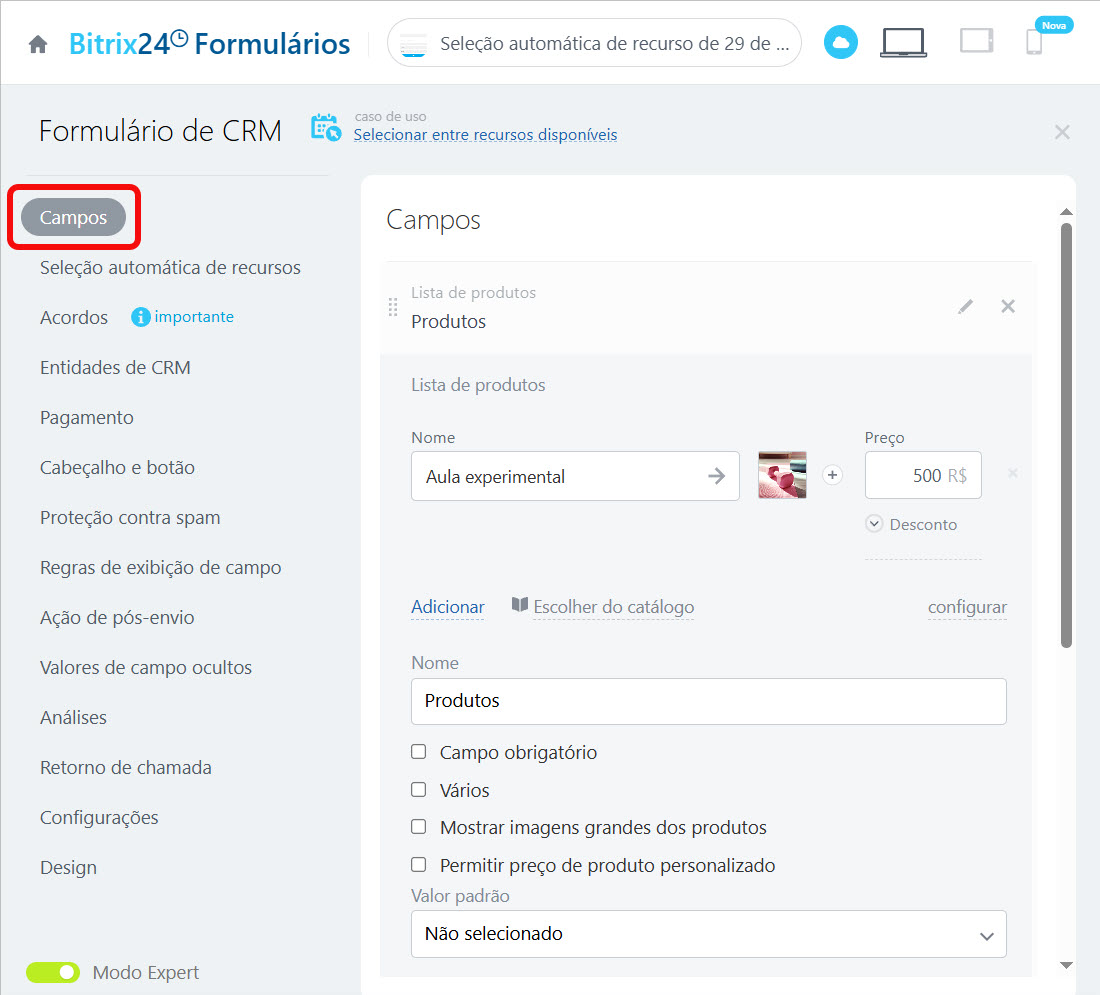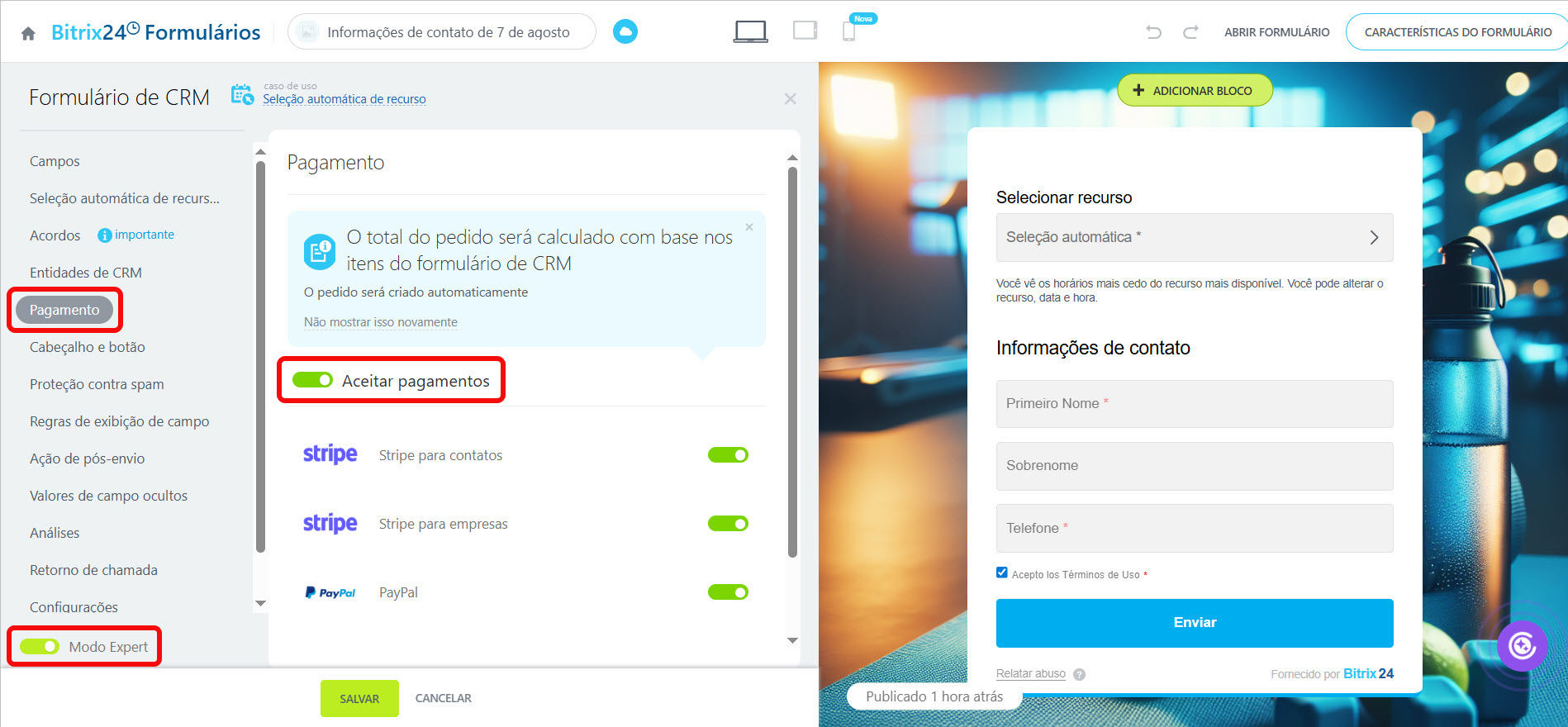 Para habilitar pagamentos, basta ativar o "Modo expert" nas configurações do formulário.