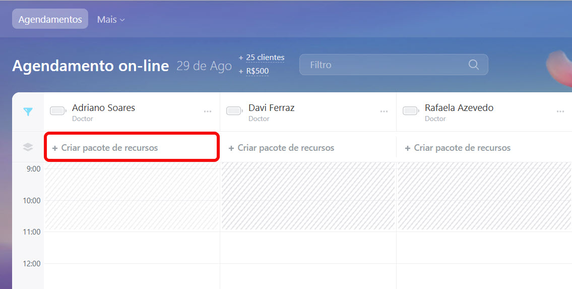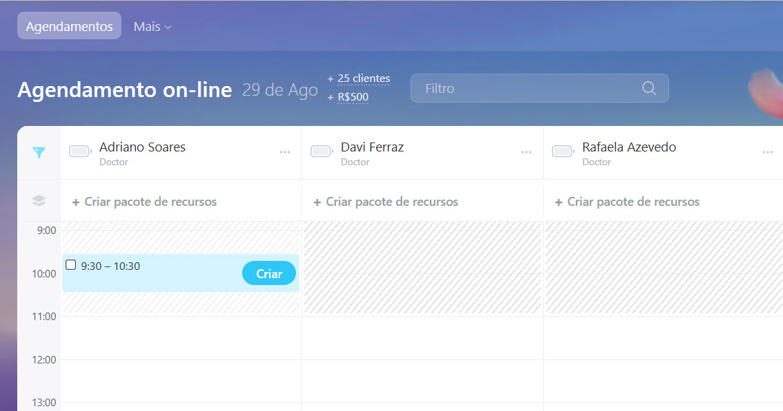 Ao receber uma solicitação, o agente acessa a seção Agendamento e selecione um horário disponível na coluna do recurso necessário.