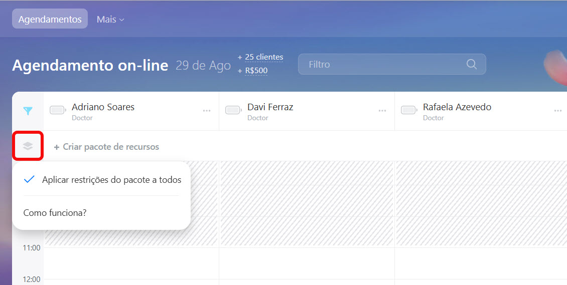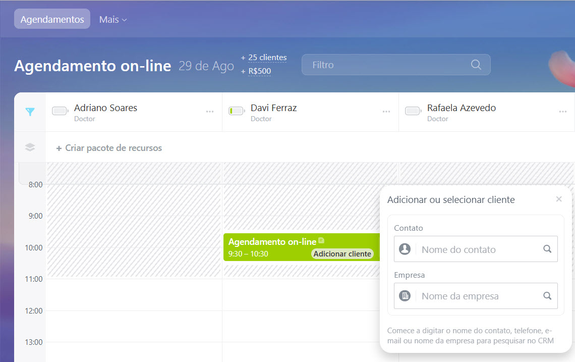 Qualquer um dos seus colaboradores pode adicionar reservas na seção Agendamento.