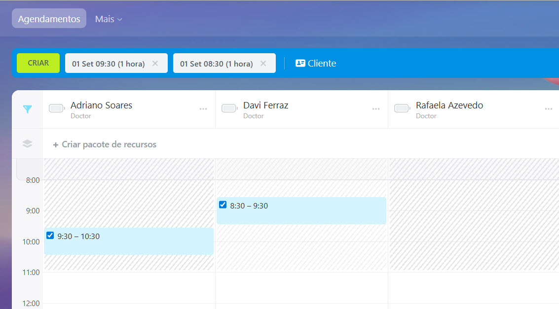 Para criar várias reservas simultaneamente, selecione múltiplos horários no painel de agendamento marcando as caixas ao lado deles.