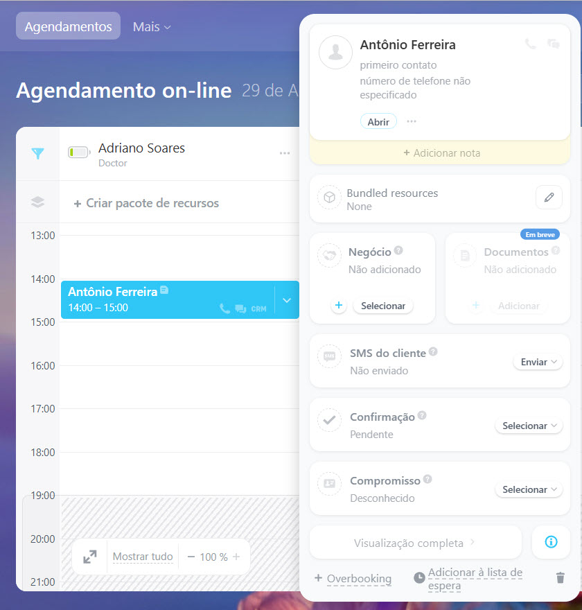 Se seu negócio permitir, o agente pode agendar o cliente em um horário já reservado. Caso ocorra um cancelamento ou reagendamento, o horário será atribuído a outro cliente.