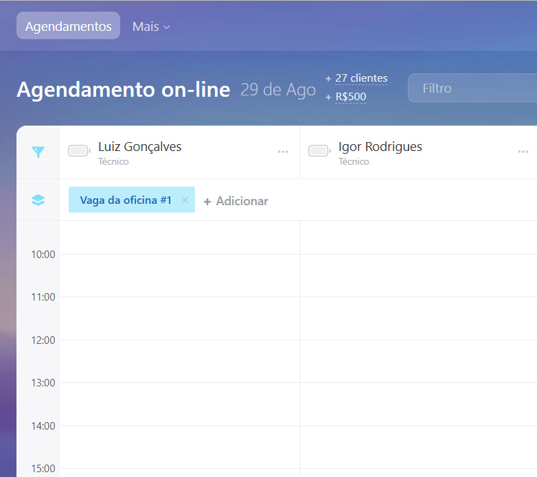 - Crie dois tipos de recursos: principais (técnicos) e auxiliares (vagas da oficina).