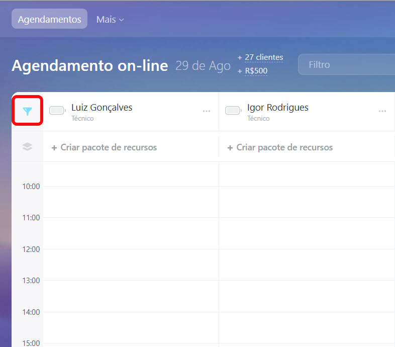 Para agendar dois recursos simultaneamente, clique em "+ Criar pacote de recursos", adicione o recurso auxiliar e crie um agendamento na coluna do recurso principal.