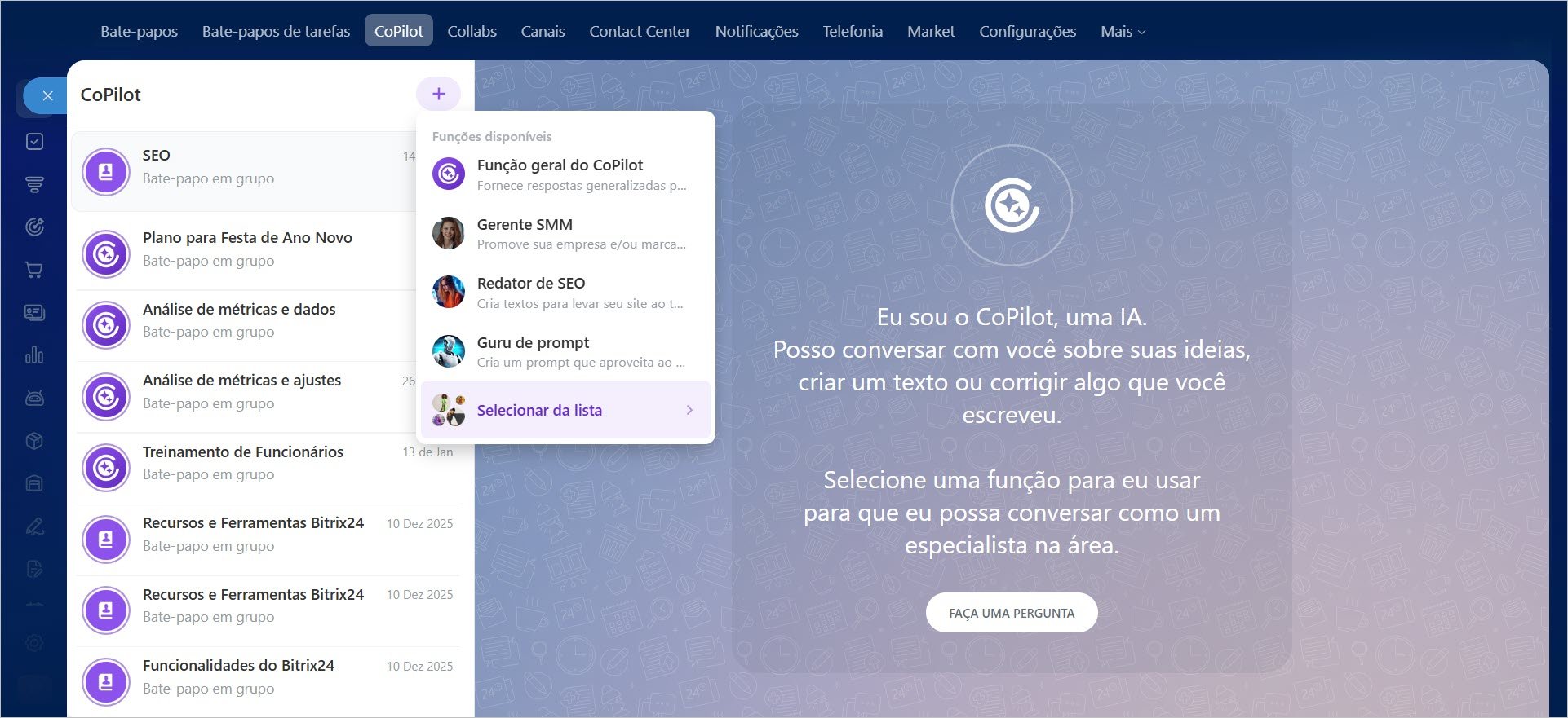 Antes de fazer uma pergunta, escolha a função apropriada para o CoPilot no menu do chat. Isso define o tom e a profundidade da resposta. Na dúvida sobre qual função escolher? Use a função Geral do CoPilot. -