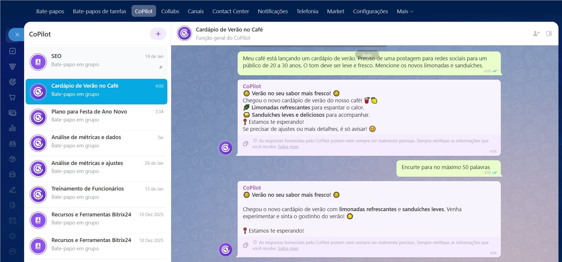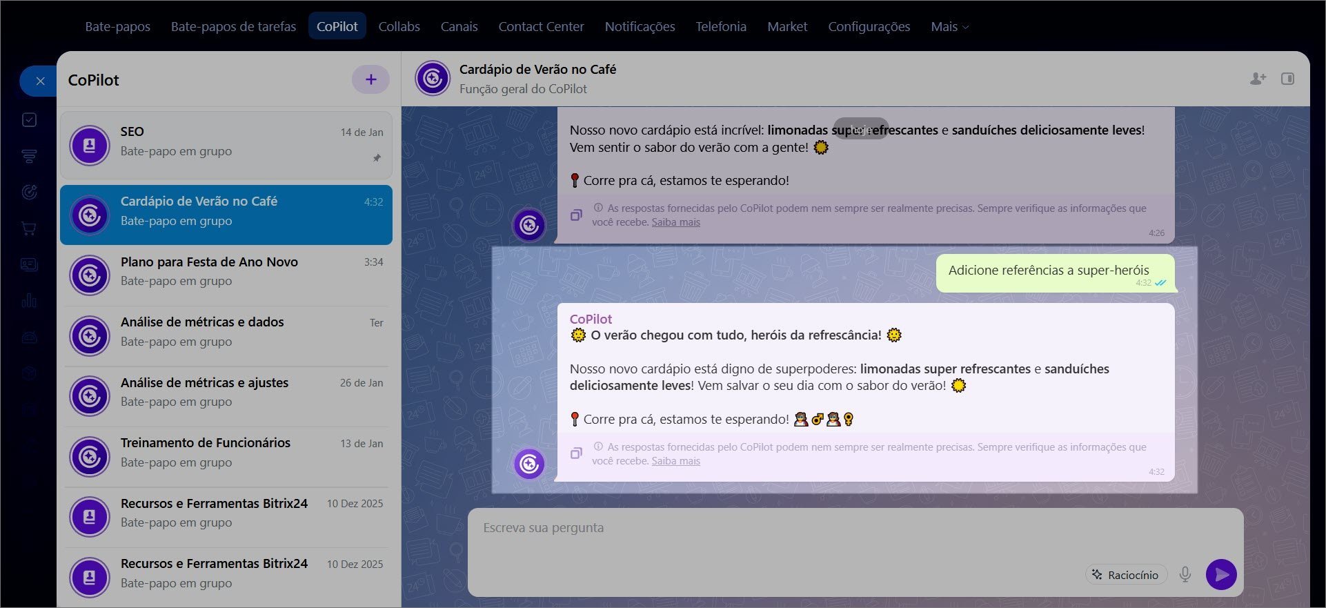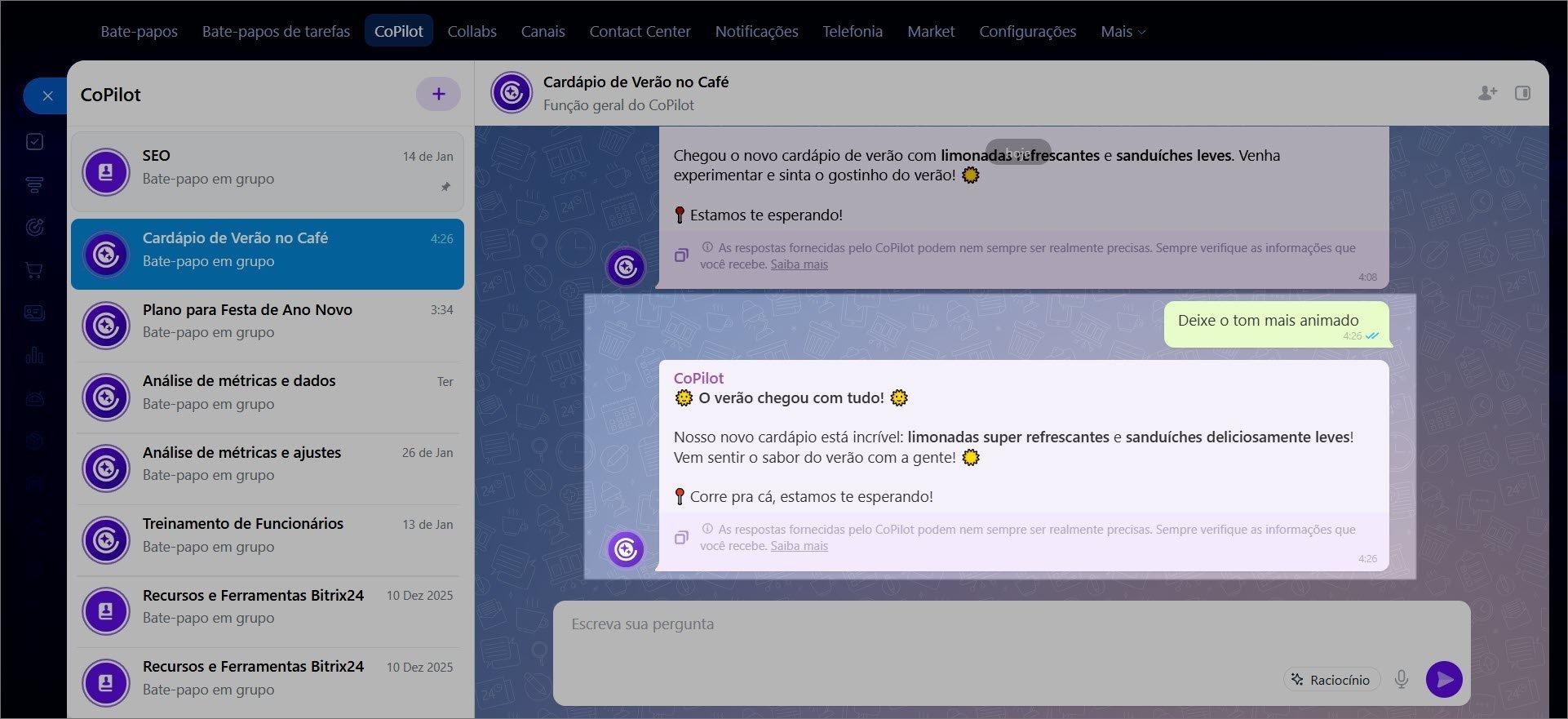 Se precisar mudar de assunto ou redefinir o contexto, basta iniciar um novo chat com o CoPilot. As informações do(s) chat(s) anterior(es) não afetarão essa nova conversa.