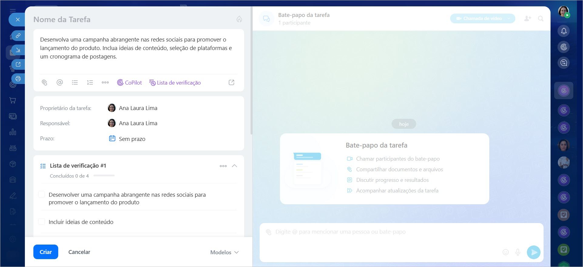 - Você pode usar o CoPilot para criar tarefas em chats, notas, colaborações e canais