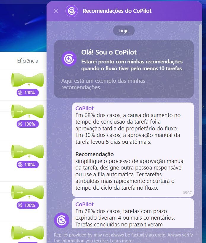 Se você usa Fluxos nas tarefas, o CoPilot analisará um fluxo selecionado, identificará pontos fracos e ineficiências e sugerirá melhorias. Se a equipe estiver indo bem, o CoPilot destacará o que a ajuda a ter sucesso.