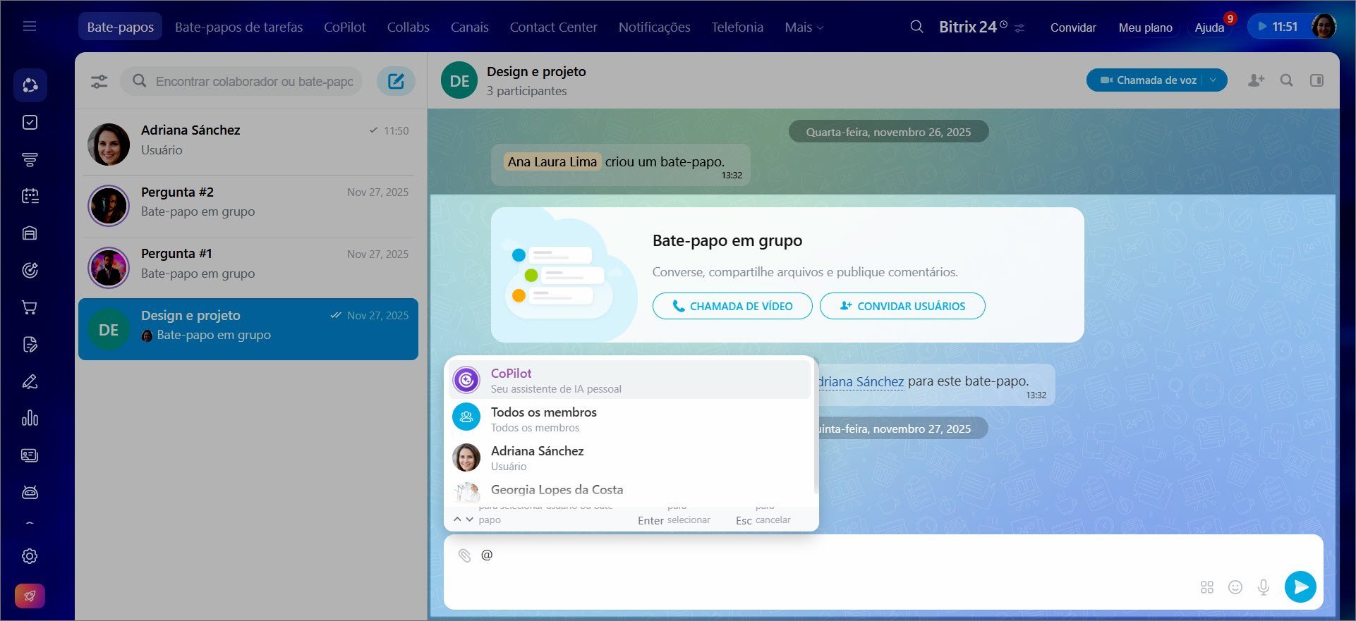 Interaja com o CoPilot diretamente dentro dos seus chats grupais ou privados no Messenger do Bitrix24. Isso é especialmente útil quando você precisa se atualizar após férias ou licença médica, resumir uma longa discussão ou integrar um novo membro à equipe.