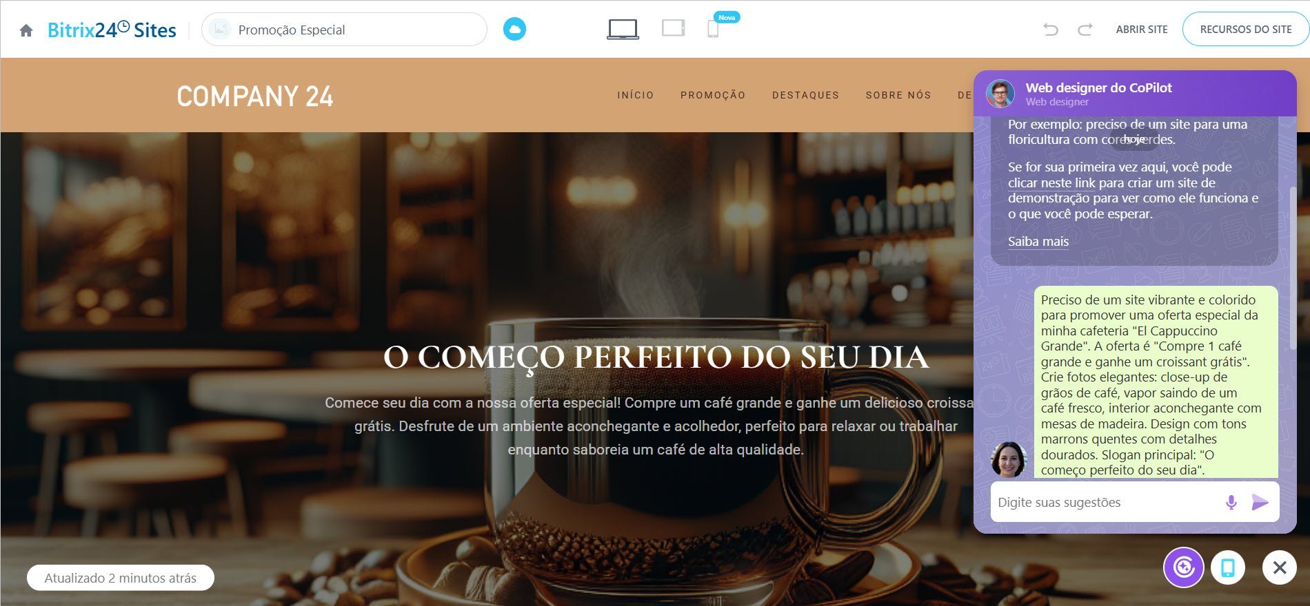 Para criar um novo site, vá para Sites e Lojas → Criar → Criar com CoPilot. No chat recém-criado, descreva seu site: tema, estilo, cores, etc.