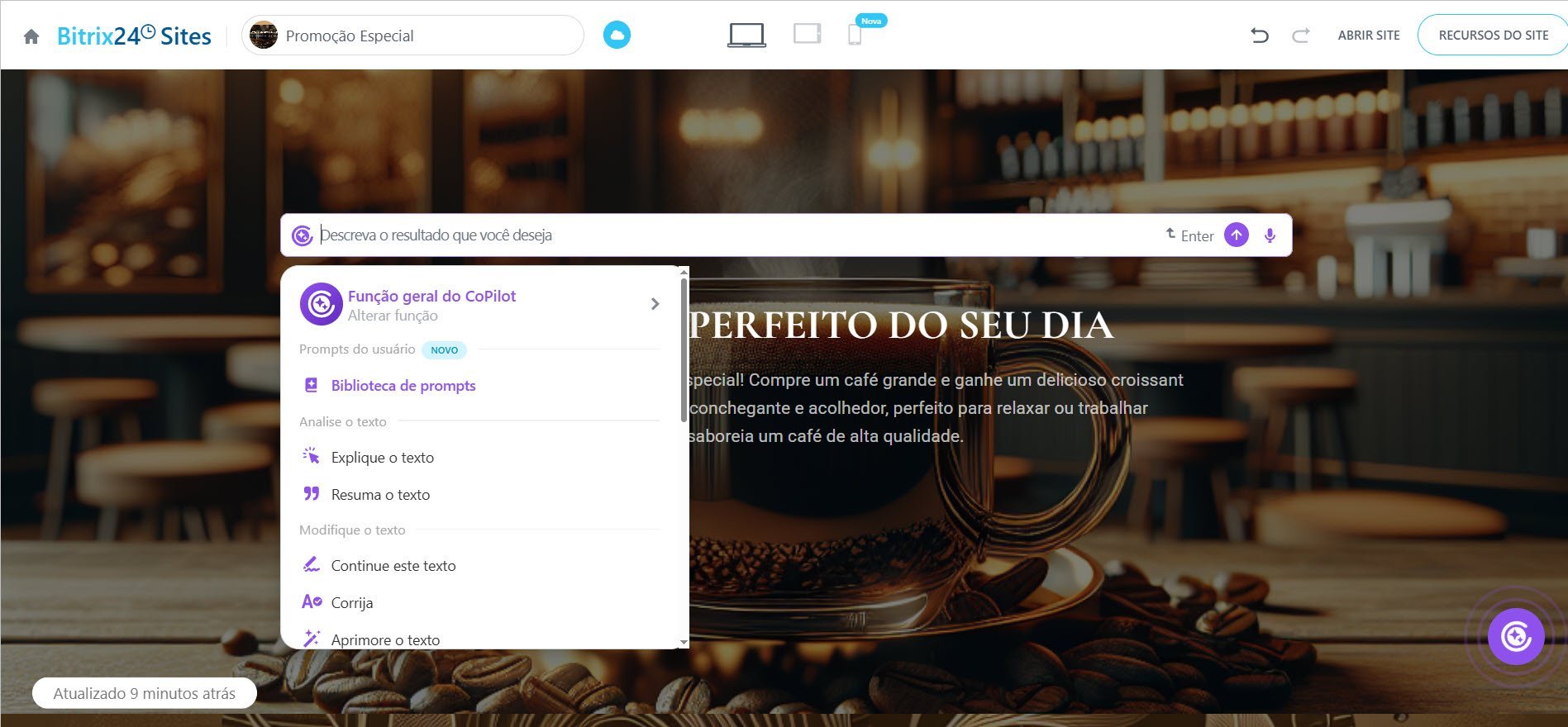 Criar um site ainda é um processo lento, caro e trabalhoso. Até uma landing page simples exige design, textos e imagens, o que pode levar semanas. E tempo é justamente o que falta quando você precisa lançar uma promoção relâmpago. A solução? O CoPilot!