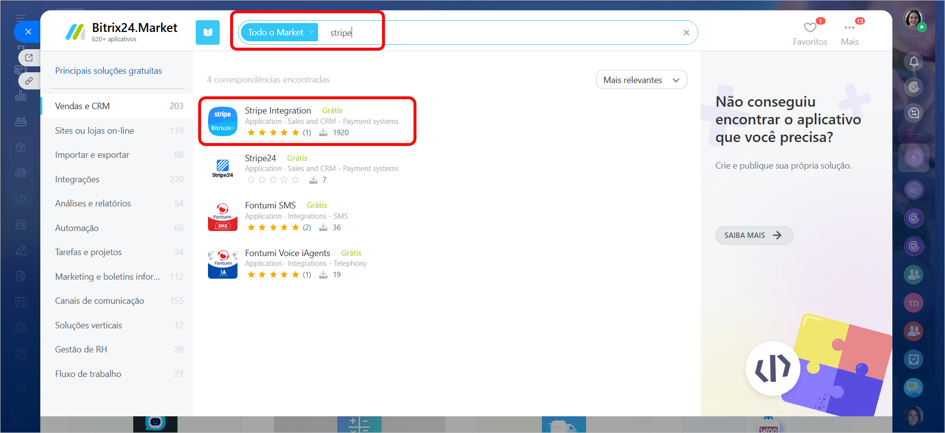 Na barra de pesquisa, digite Stripe e clique no aplicativo Stripe Integration.