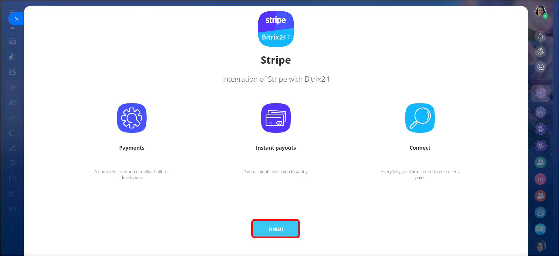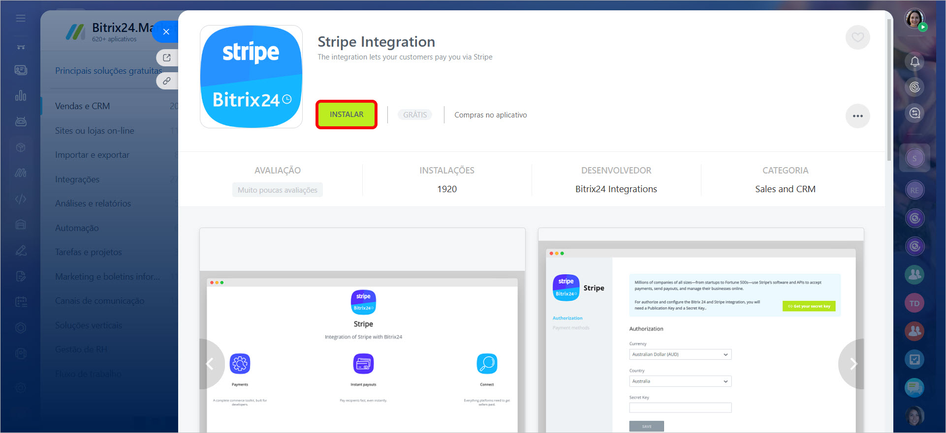 Se você quiser aceitar pagamentos através do Stripe, instale o aplicativo Stripe Integration do Bitrix24 Market.