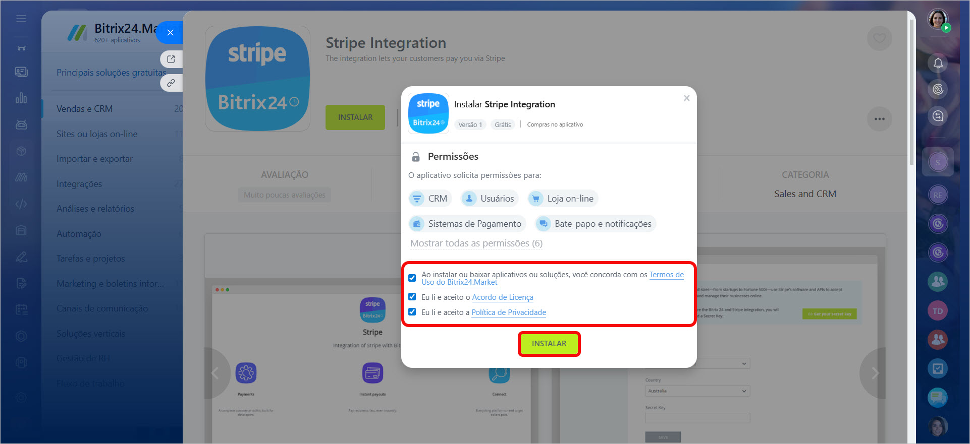 Leia e aceite o Acordo de Licença, a Política de Privacidade e os Termos de Uso do Bitrix24.Market. Clique em Instalar.