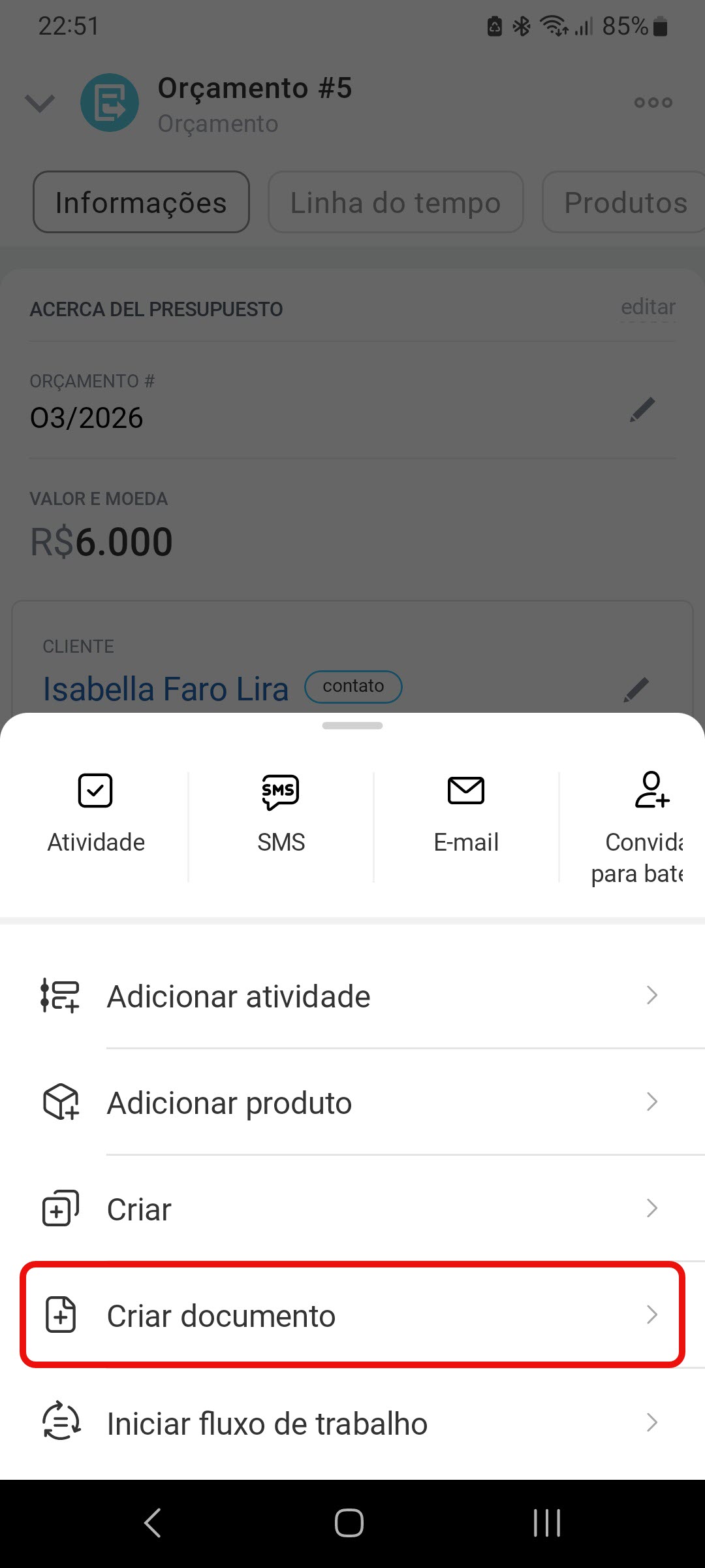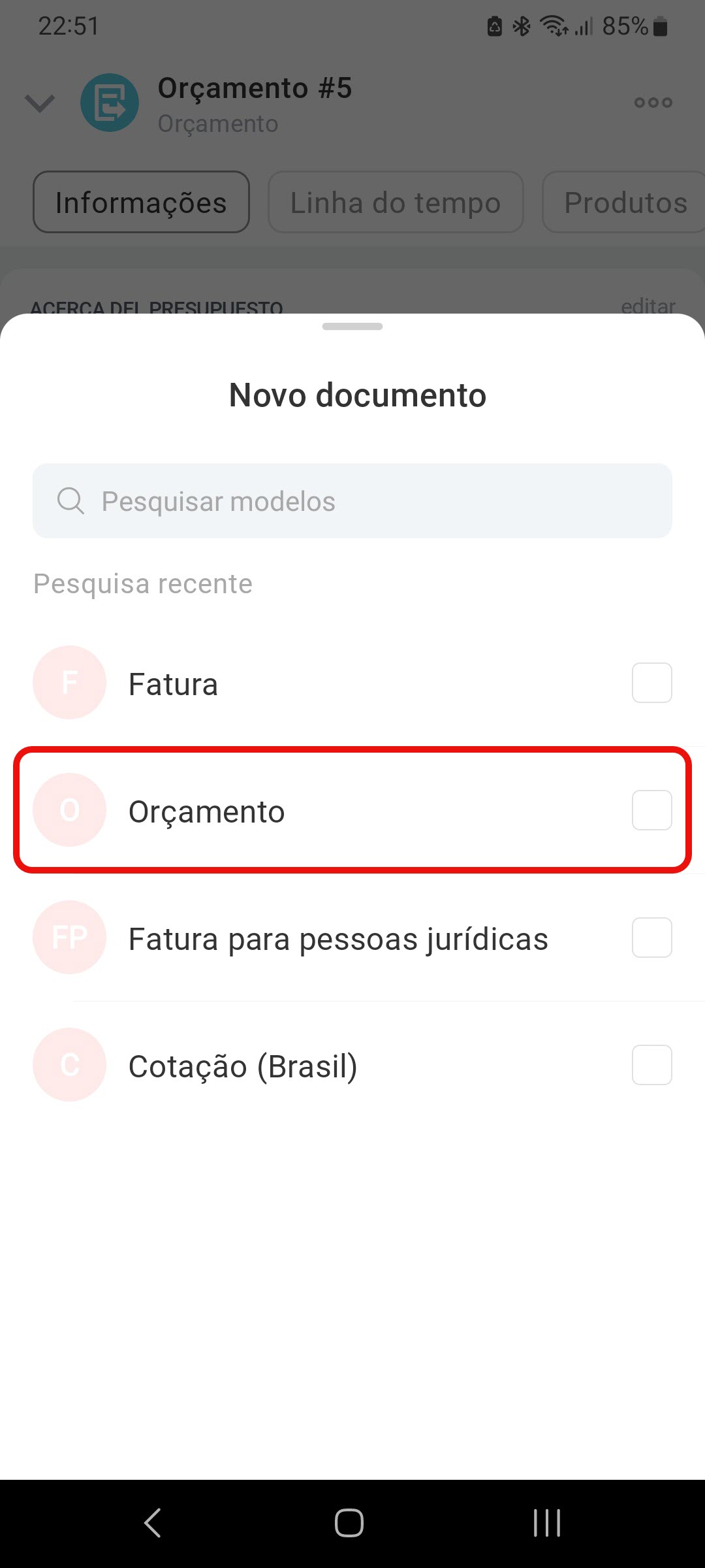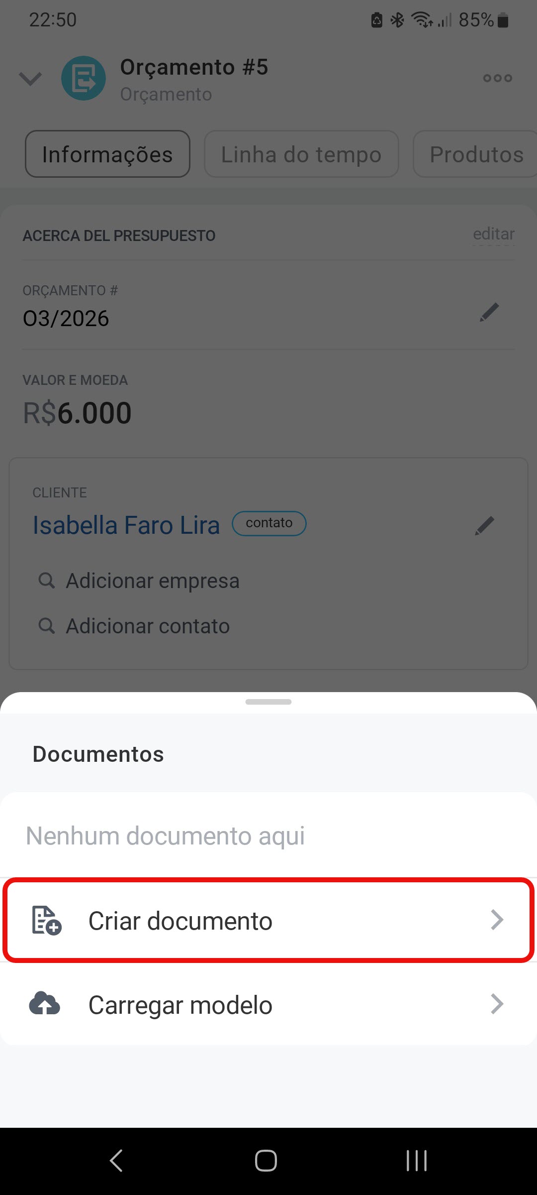 No CRM móvel, é possível criar documentos a partir de um modelo, por exemplo, fatura, contrato ou orçamento.