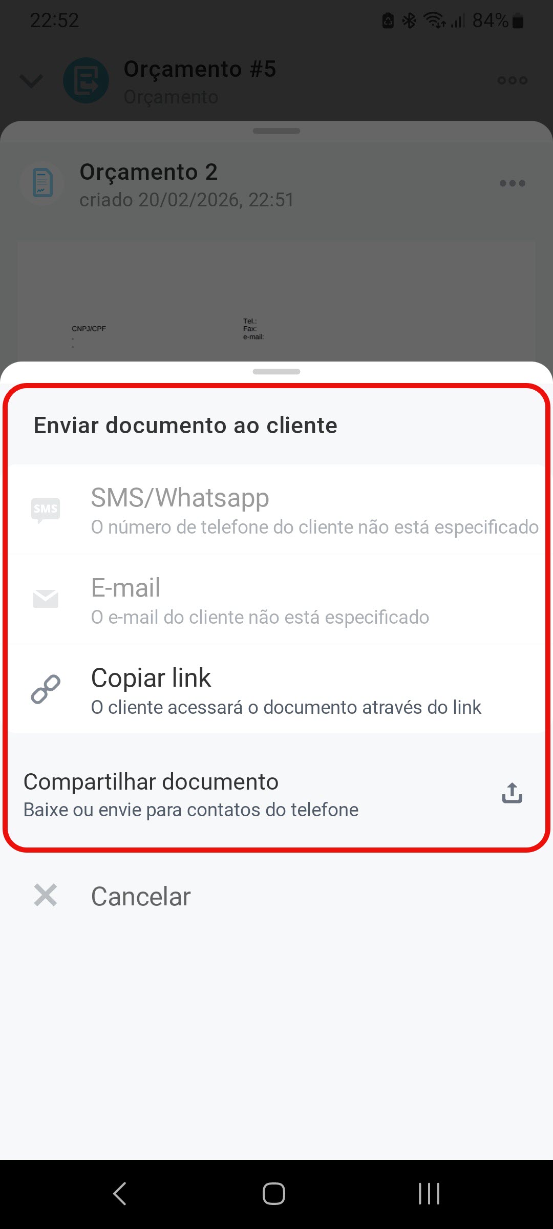 - Por SMS: se você tem um provedor de SMS configurado e o número de telefone do cliente cadastrado. O cliente receberá um link para o documento.