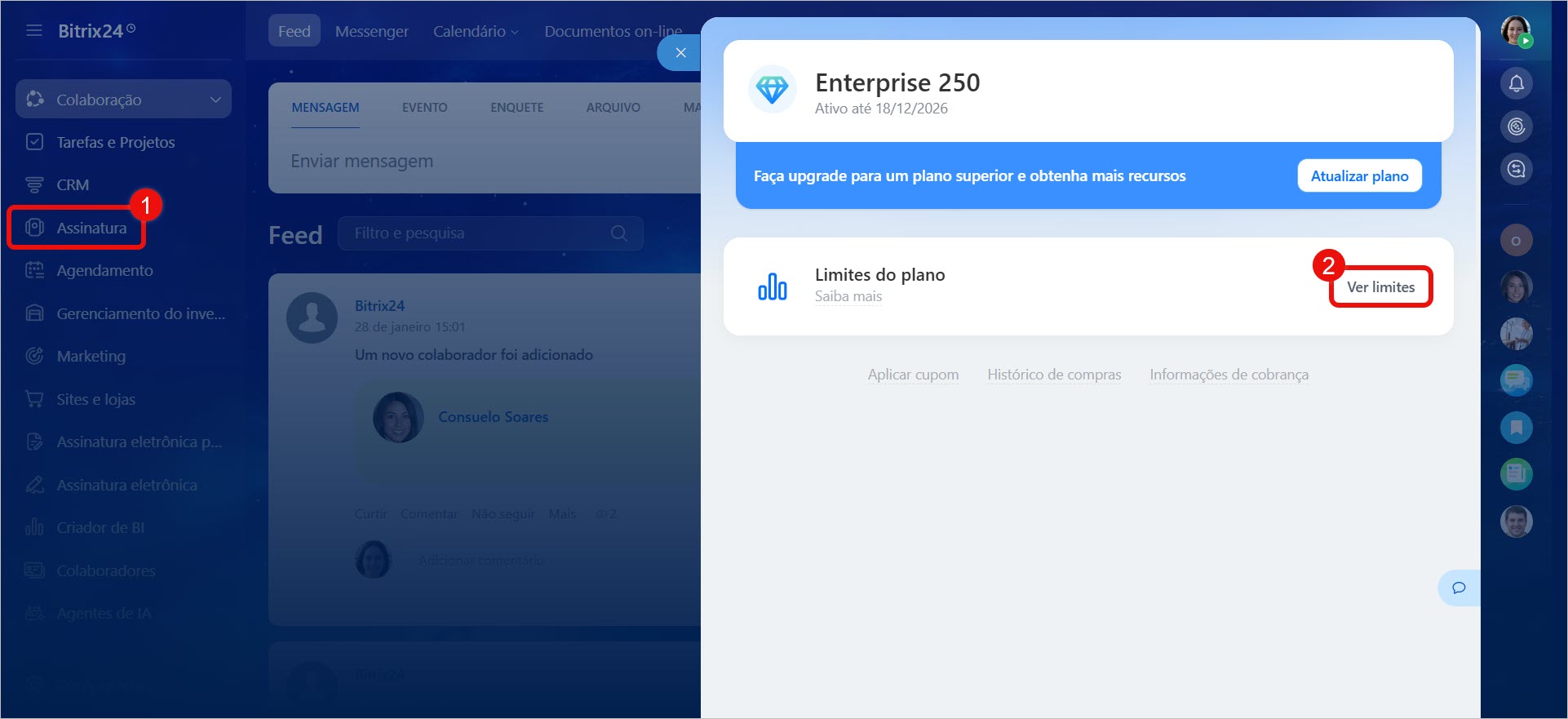Acesse a seção Assinatura no menu lateral esquerdo > clique em Ver limites. Nesta página, você verá informações sobre os usuários: o número máximo de usuários no seu plano e o número atual de usuários na conta.