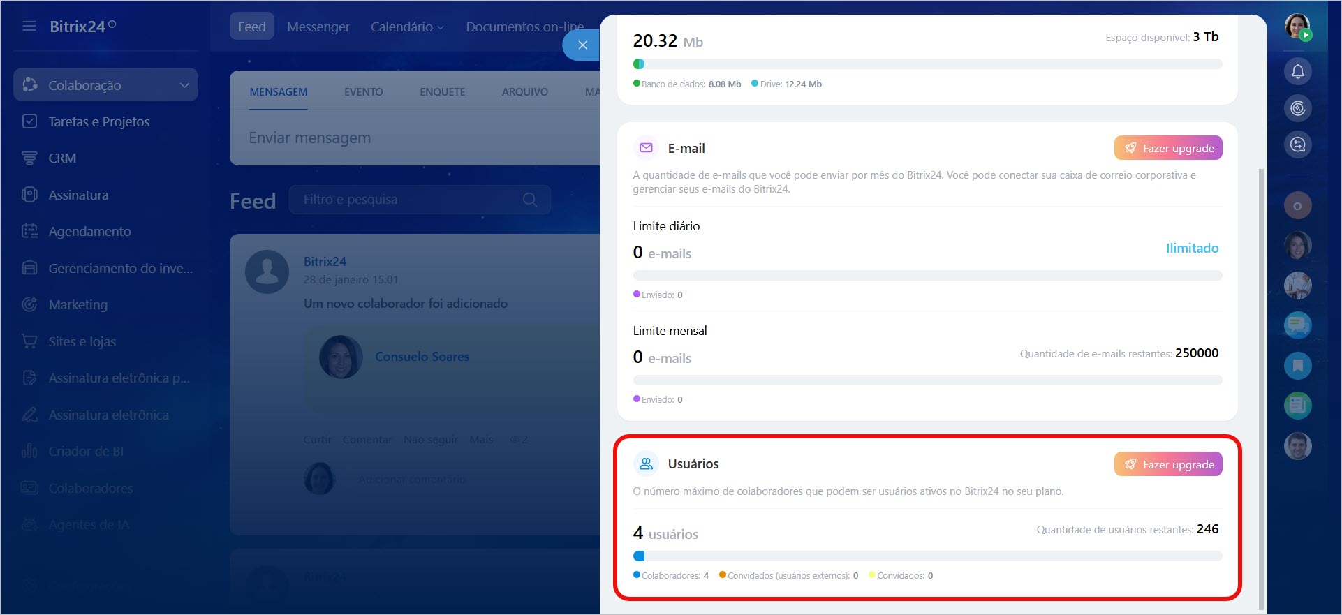 - O número máximo de usuários do Bitrix24 em Nuvem depende do plano de assinatura.