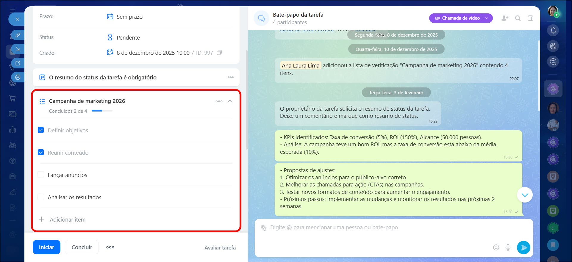 Com as Tarefas, você pode acompanhar o processo de trabalho dos colaboradores, controlar prazos e distribuir responsabilidades. Por exemplo, um supervisor criou a tarefa "Lançar campanha publicitária". Na tarefa, a meta é descrita, os prazos e os responsáveis são definidos. O profissional de marketing e o designer discutem ajustes no bate-papo da tarefa e anexam os materiais necessários. O supervisor vê em que etapa a tarefa está, sem mensagens extras ou reuniões.
