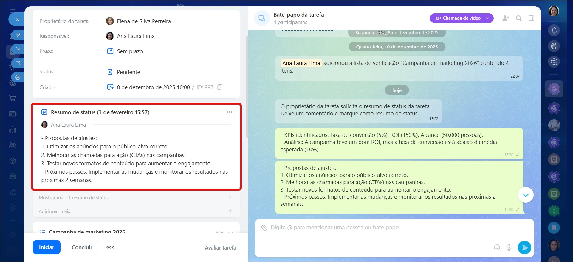 Resultado da tarefa. Marque o resultado do trabalho para que o supervisor não precise procurá-lo na conversa. Para isso, adicione um relatório na seção "O resumo do status da tarefa é obrigatório" ou envie uma mensagem no bate-papo da tarefa e marque-a como resultado.