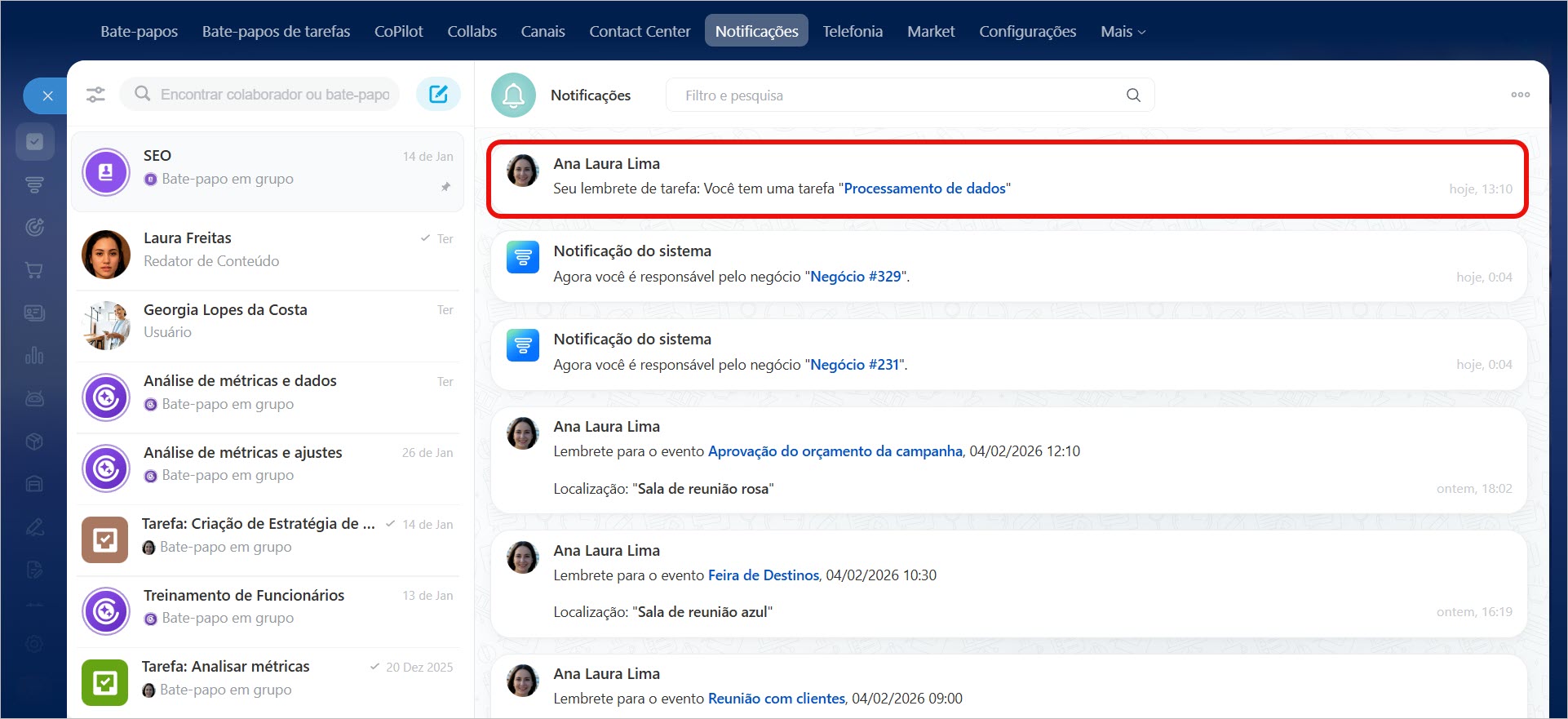 Lembretes. Configure lembretes de tarefas como notificações no Bitrix24 ou mensagens por E-mail. Assim, você pode executar tarefas no prazo e cumprir os prazos. Qualquer participante pode adicionar um lembrete para si ou para colegas - o responsável, quem criou a tarefa ou um participante. Isso pode ser feito ao criar e editar uma tarefa.