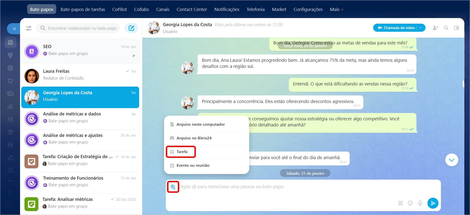 As Tarefas no Bitrix24 estão conectadas a outras ferramentas. Se um supervisor deu uma atribuição em um bate-papo, você pode criar uma tarefa imediatamente com base nessa mensagem. O texto da mensagem se tornará a descrição da tarefa, você será o responsável e os participantes do bate-papo serão os observadores.