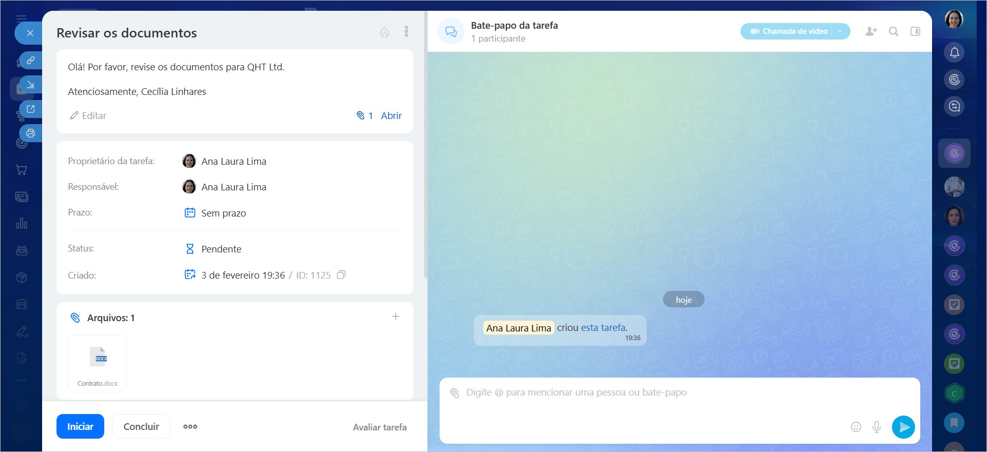 Quando o e-mail for enviado, a tarefa aparecerá no Bitrix24. Por padrão, o funcionário de cujo perfil o link foi copiado será o criador e o responsável pela tarefa. As funções dos usuários podem ser alteradas.