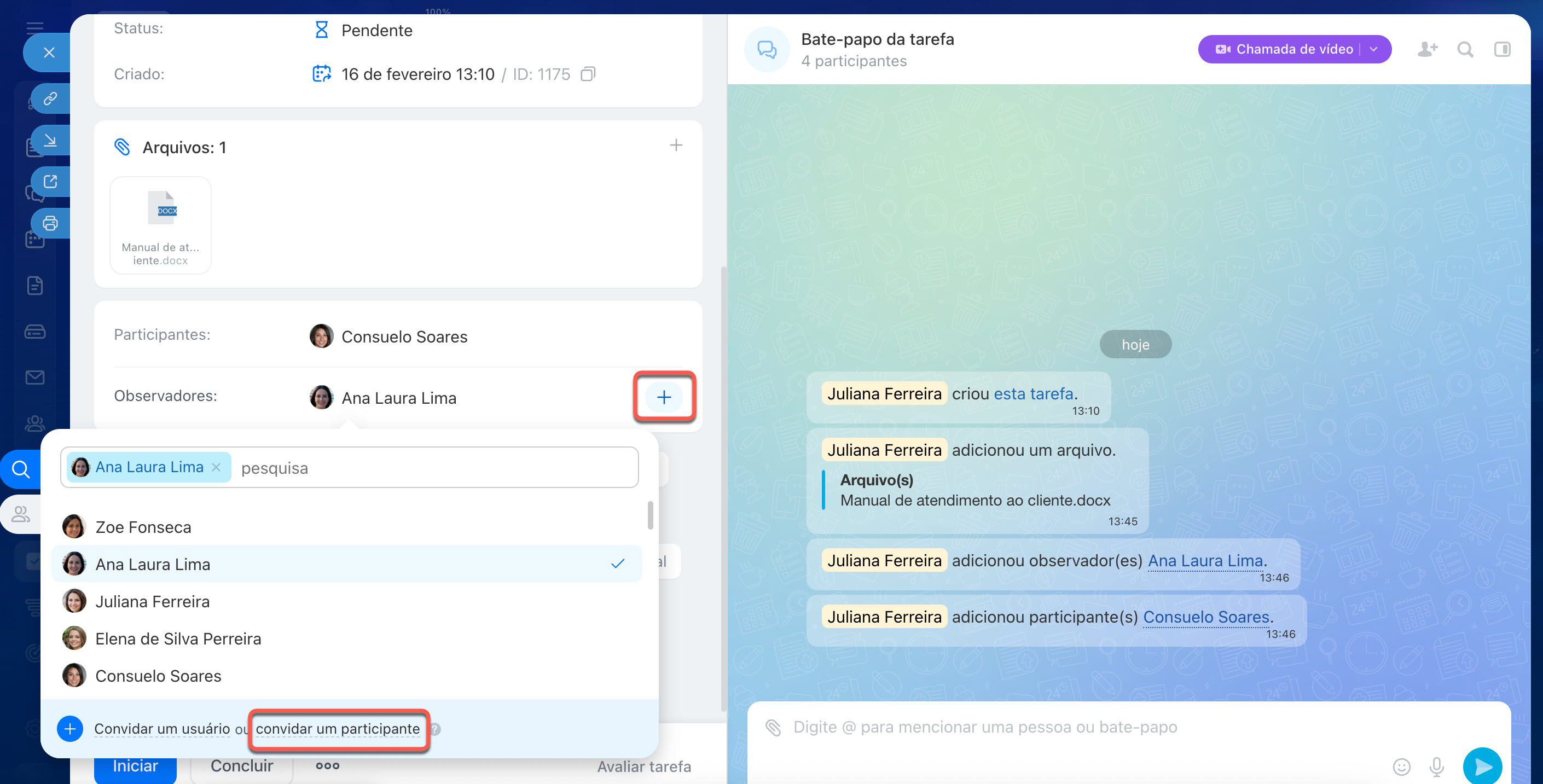 Um usuário externo pode ser responsável por uma tarefa, participante ou observador. Defina sua função e, no campo obrigatório clique em + > Convidar um participante.