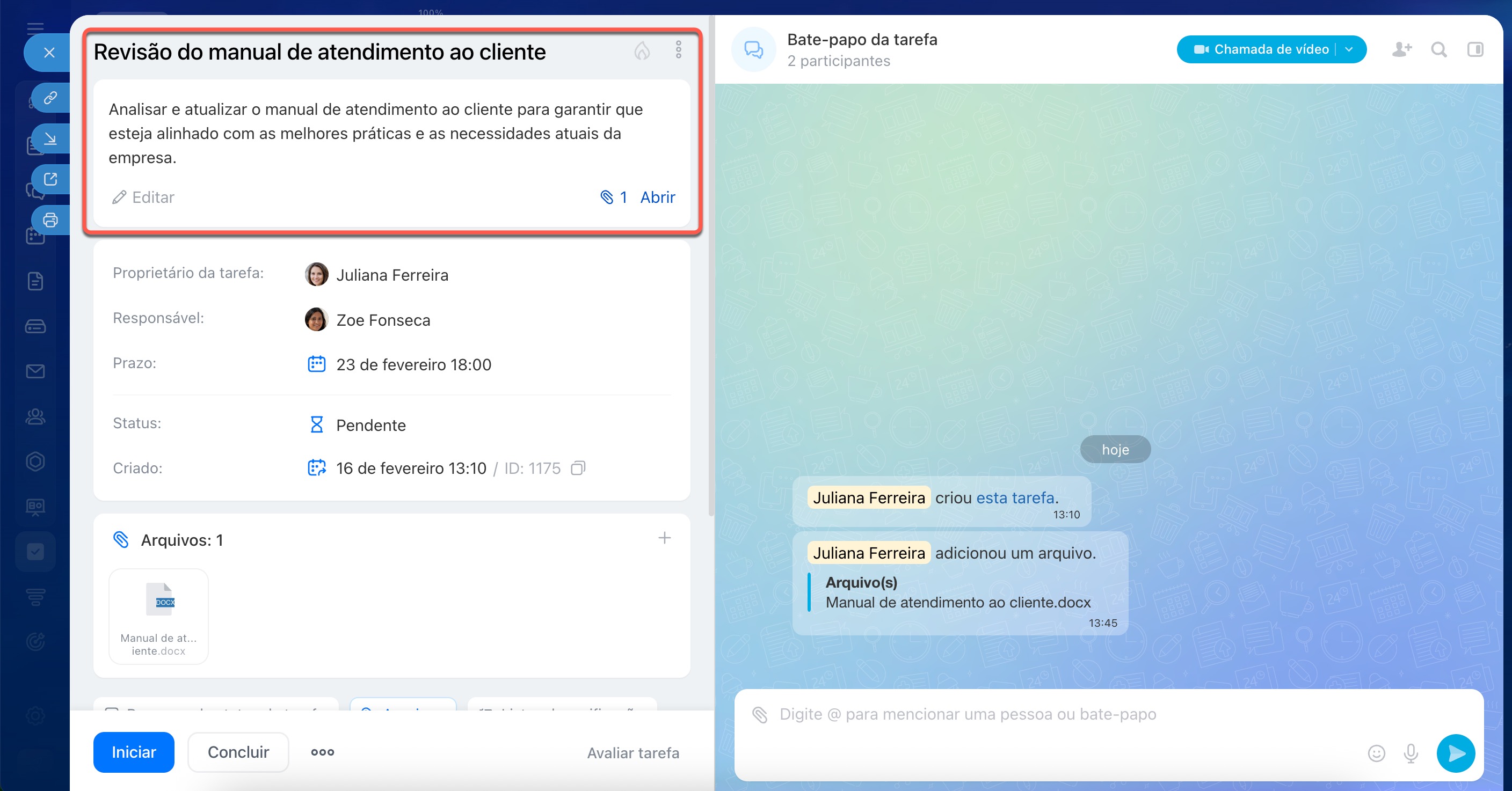 Um usuário externo pode acompanhar cada etapa da tarefa e deixar mensagens nos comentários. A cada alteração na tarefa, ele receberá uma notificação por e-mail.