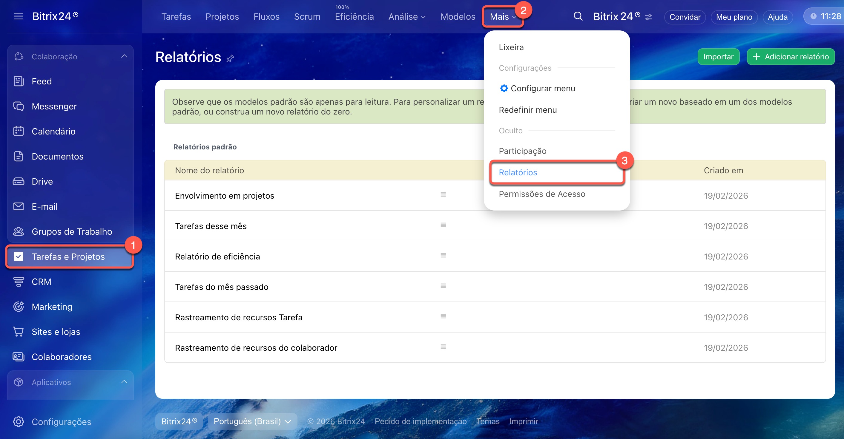 Abra a seção Tarefas e Projetos e clique em Mais > Relatórios e uma lista de relatórios será aberta.