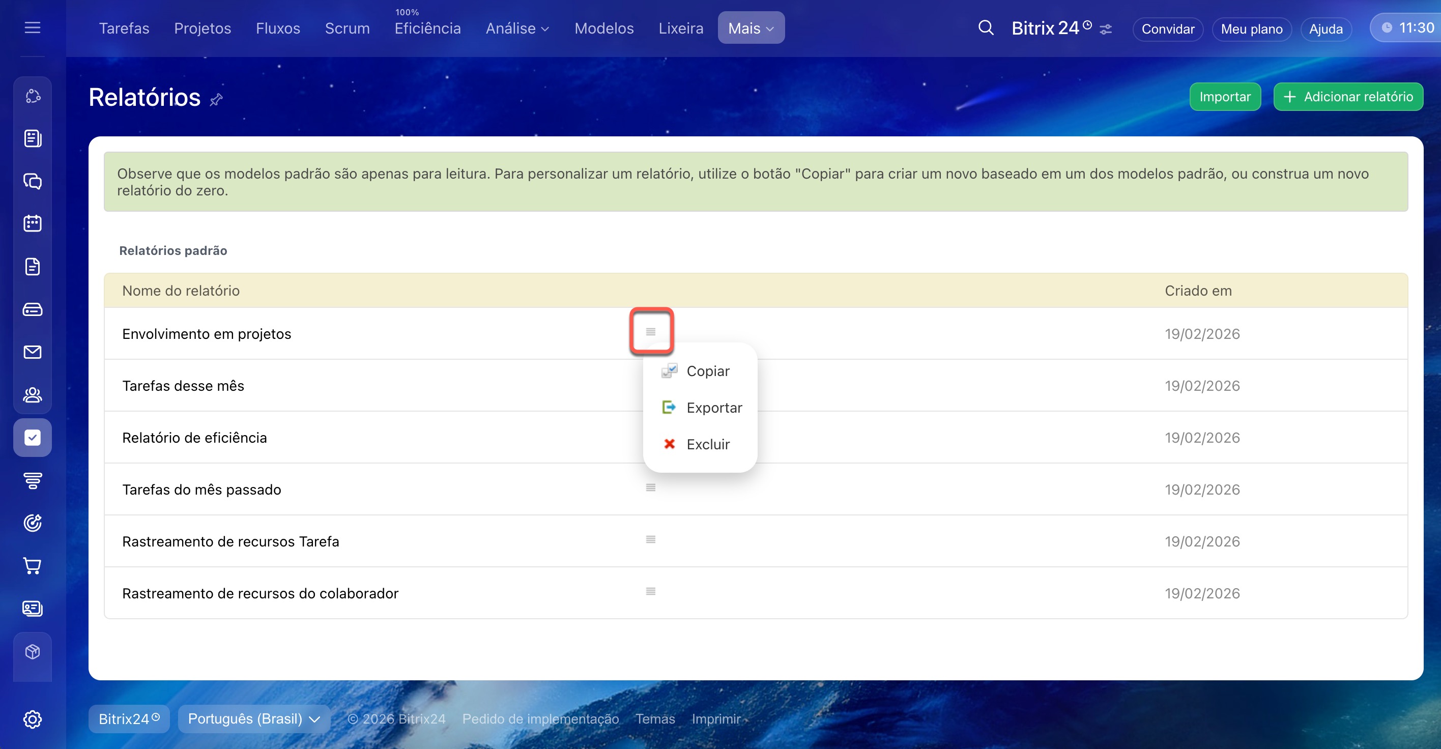 Os relatórios padrão não podem ser editados, mas podem ser copiados, exportados ou, excluídos. Essas ações estão disponíveis clicando no botão ao lado do relatório.