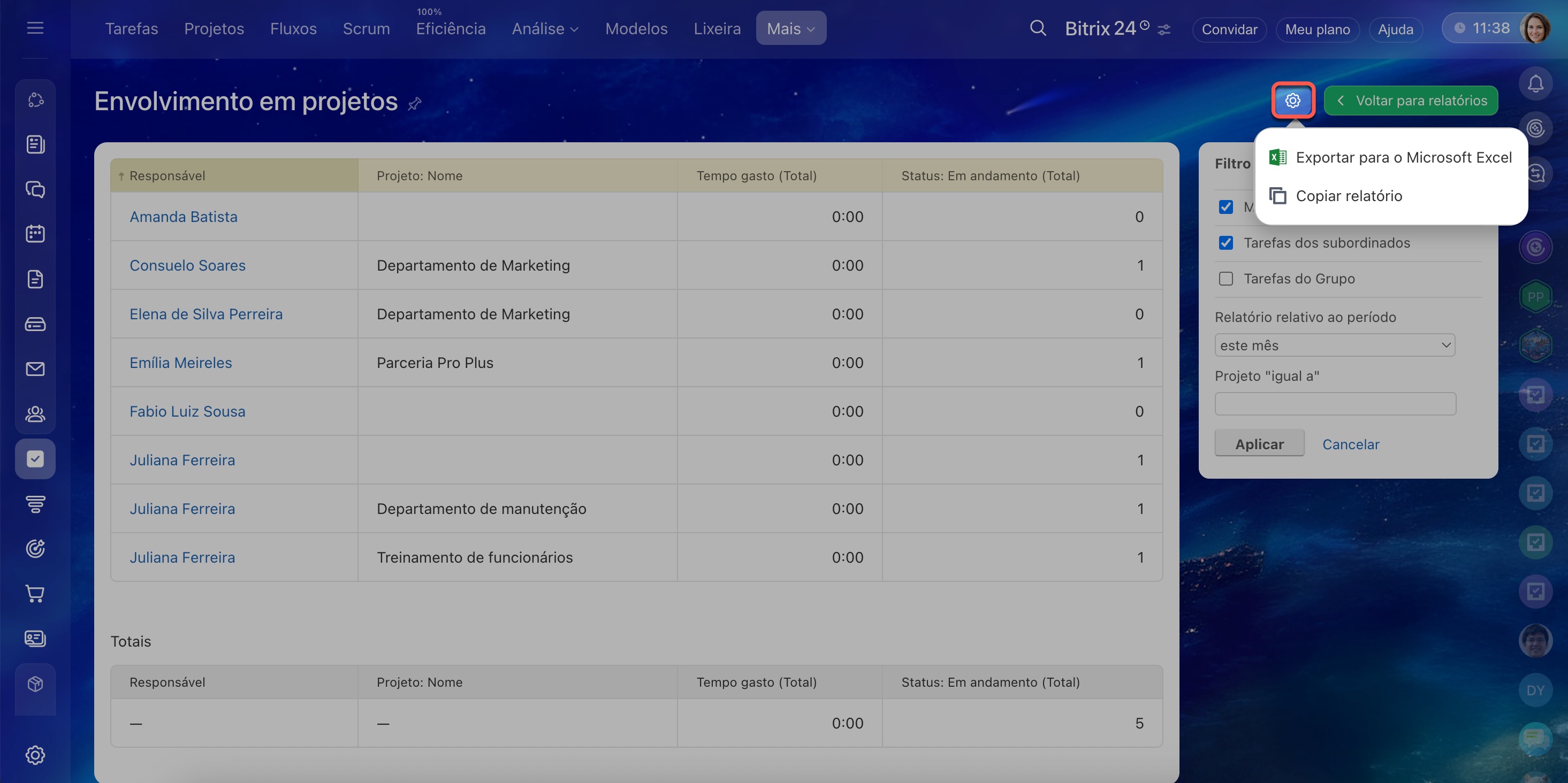Acesse o relatório e clique na engrenagem (⚙️). E então, você vai visualizar as opções de exportar ou excluir o relatório.