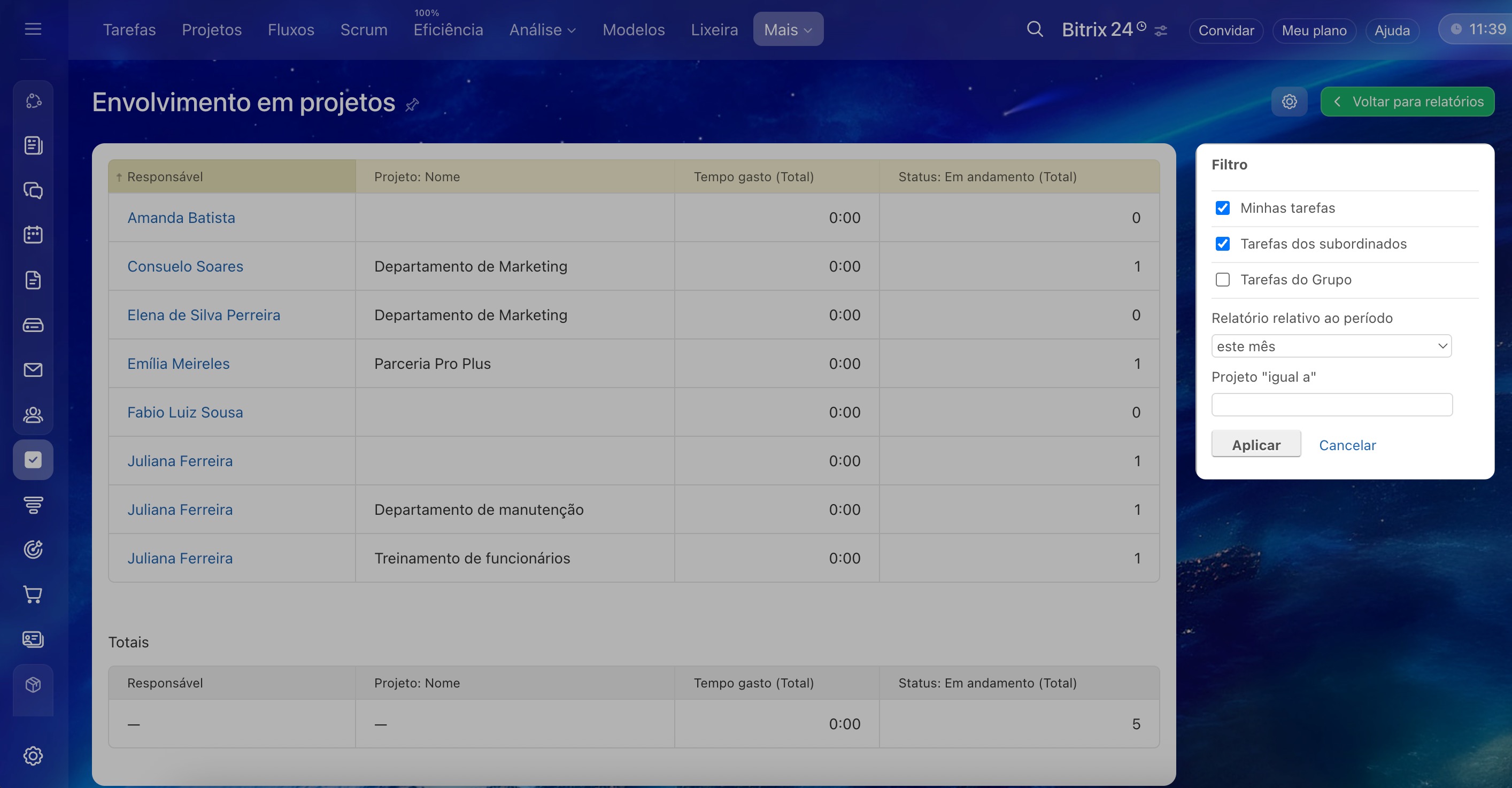O relatório mostra quantas tarefas em projetos e grupos são executadas pelos funcionários.