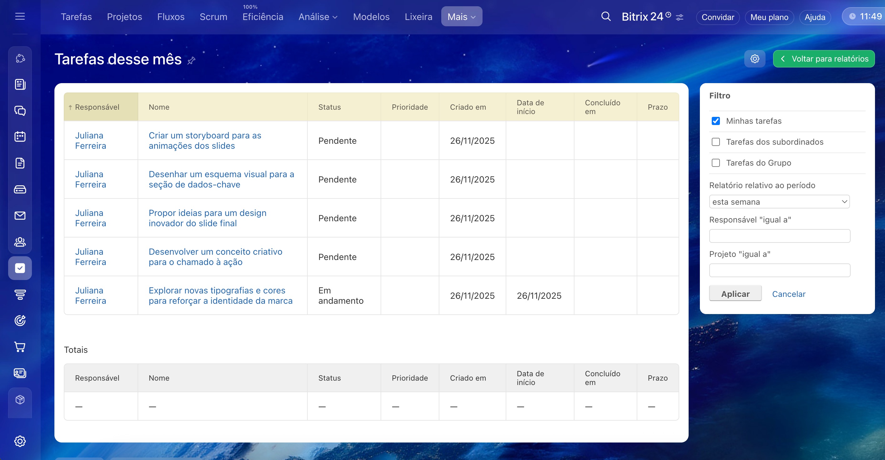O relatório mostra as tarefas que precisam ser concluídas durante o mês vigente e inclui tarefas com status: pendente, em andamento, concluída e atrasada.
