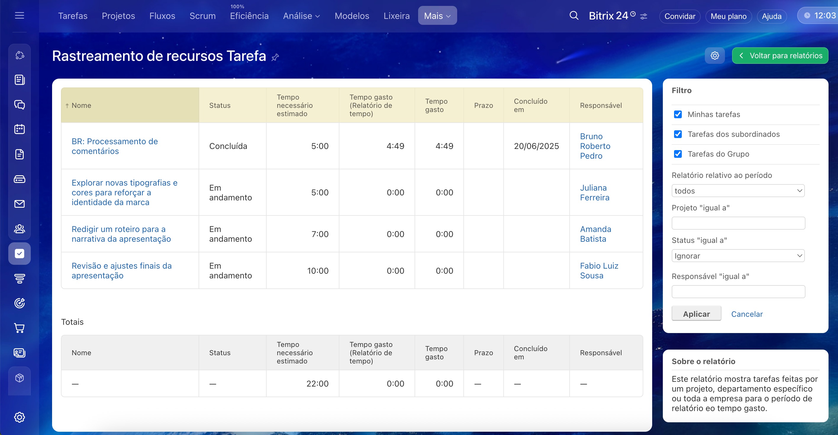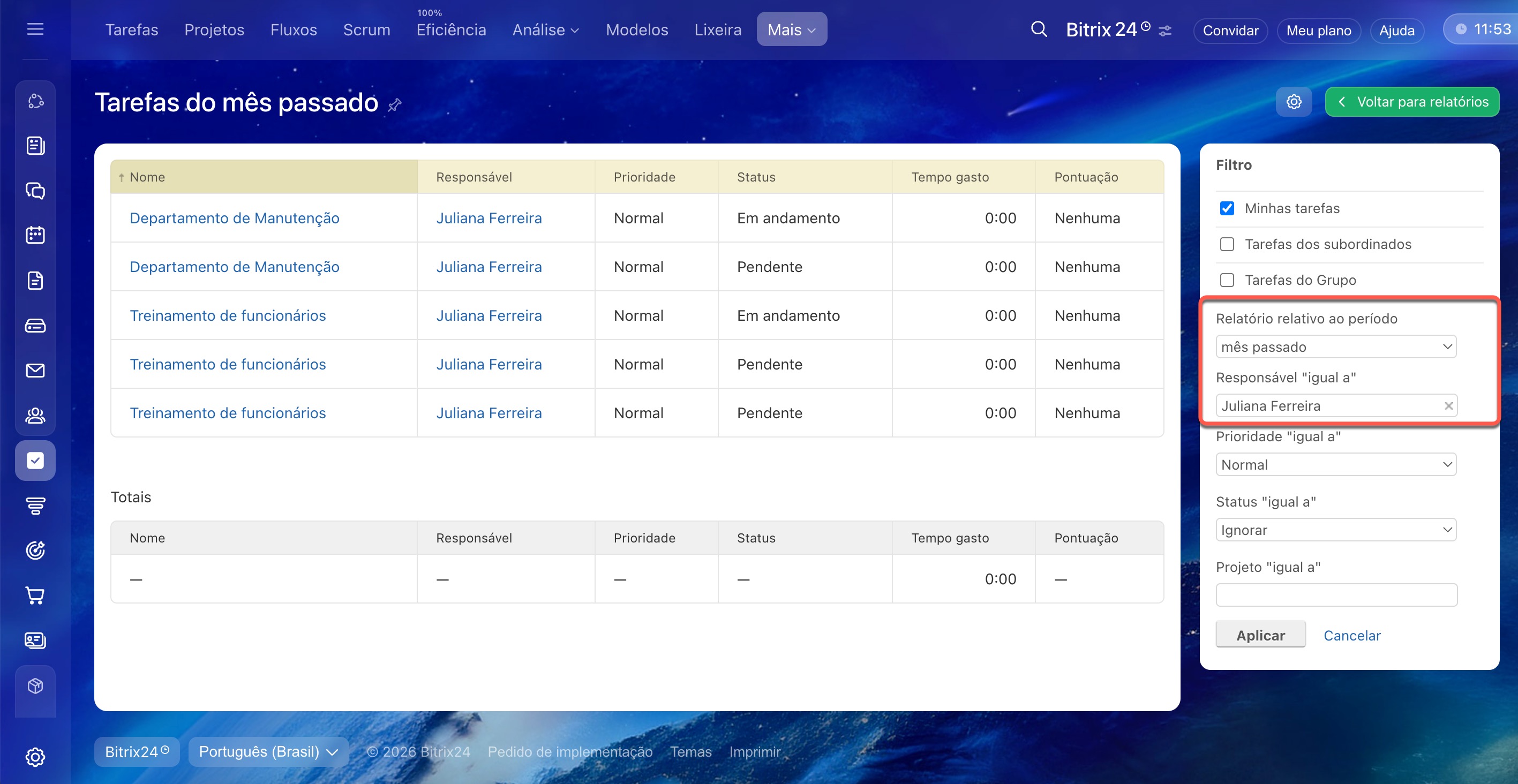 No relatório, você pode ver as tarefas com qualquer status do último mês. Use os filtros à direita para personalizar seu relatório. No campo pessoa responsável,, insira o nome do funcionário e, no campo Igual ao Status, selecione a opção ignorar.