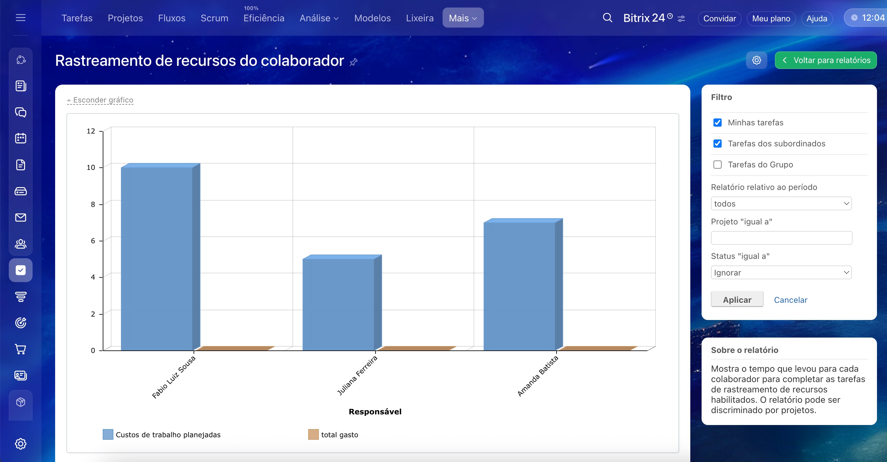 O relatório mostra quanto tempo cada executor gastou na execução de tarefas com contabilidade de recursos. O relatório também pode exibir resultados provenientes de projetos. Além disso, você pode habilitar a opção Mostrar gráfico, logo acima da tabela, para que você possa visualizar os resultados desta forma.