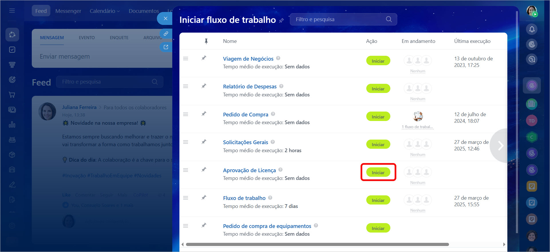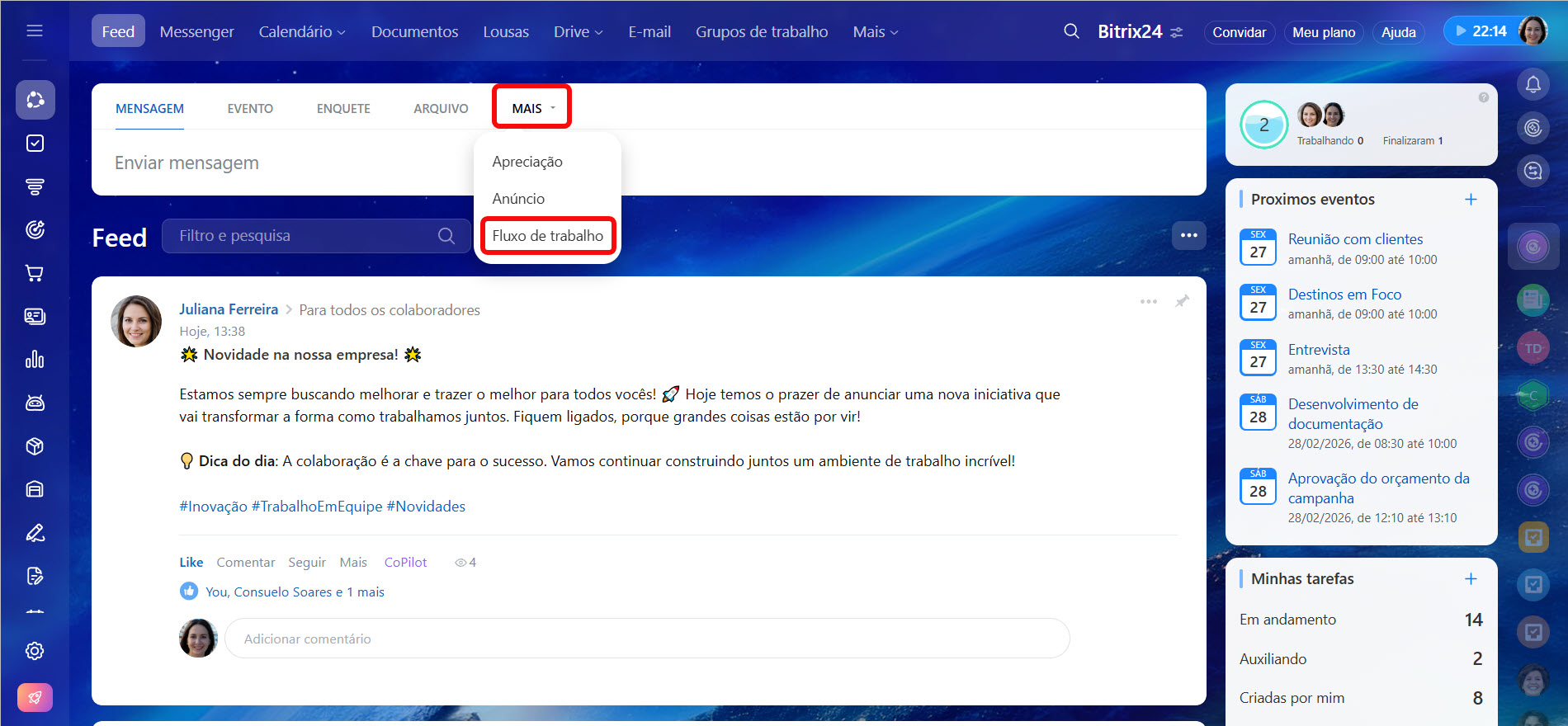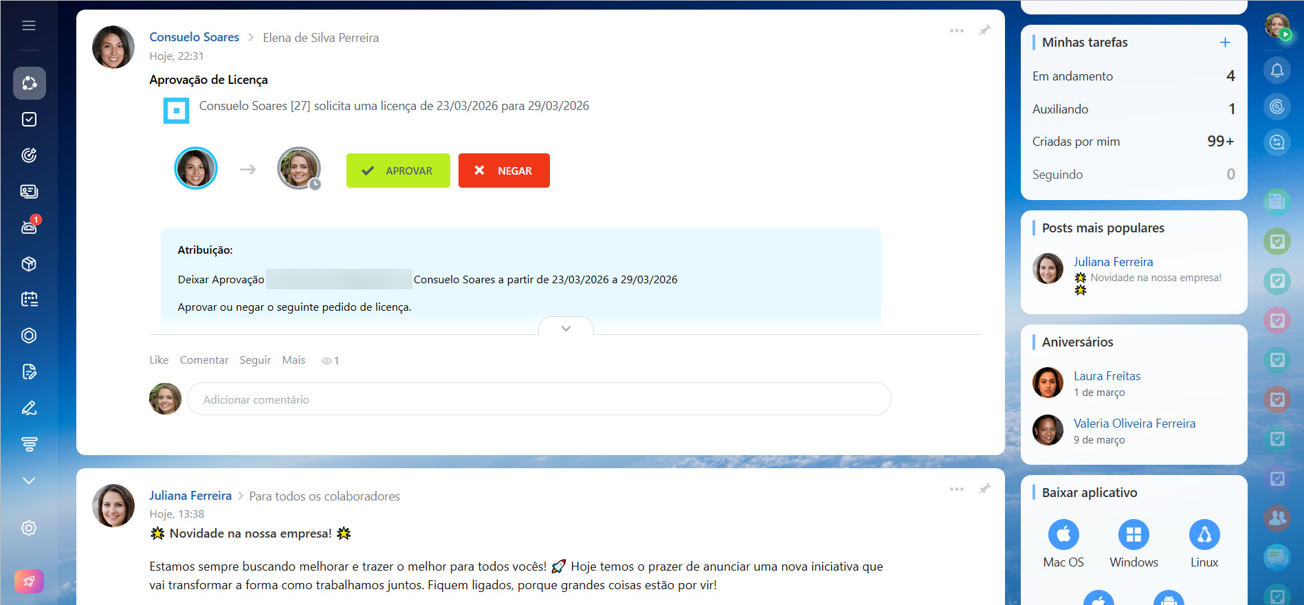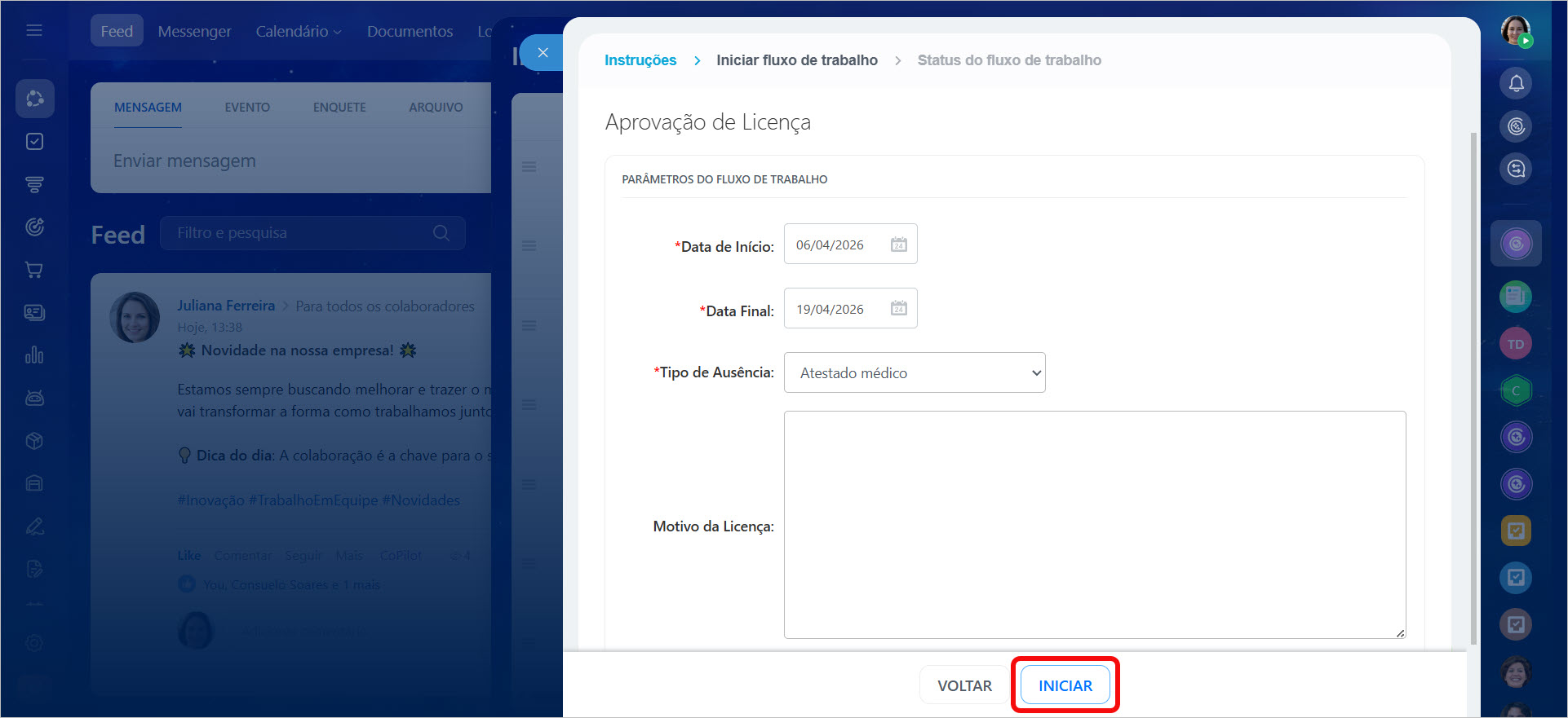 Se você está planejando férias, viagem de negócios, licença de maternidade ou licença não remunerada, você pode iniciar a solicitação de licença diretamente no Feed do seu Bitrix24.