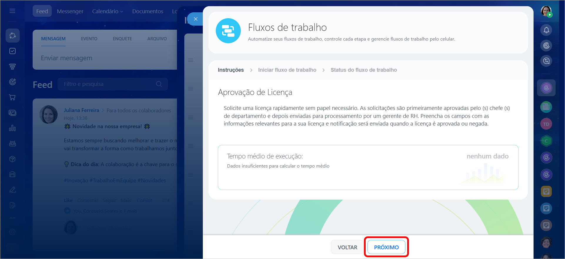 Selecione o fluxo de trabalho Aprovação de licença. Clique em Iniciar > Próximo.