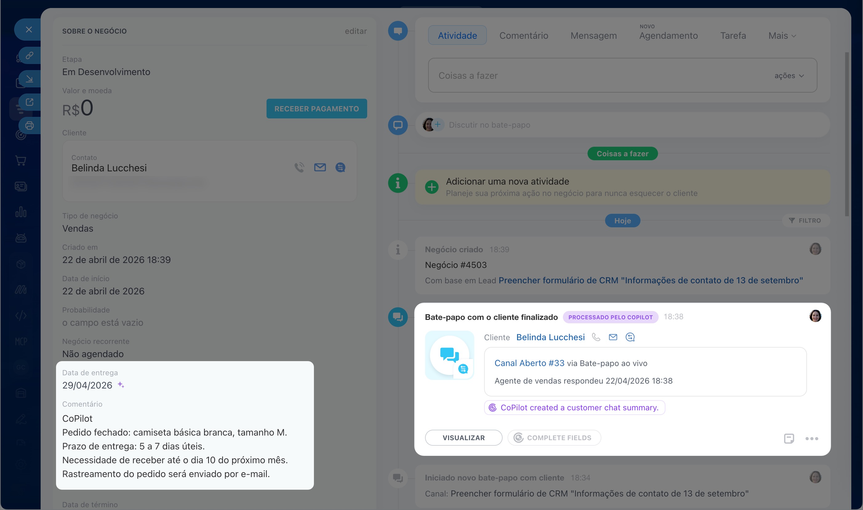 O CoPilot, um assistente de IA, pode ajudá-lo a economizar tempo escrevendo textos, processando chamadas de clientes e definindo tarefas, fazendo com que você se concentre apenas nos assuntos mais importantes do dia-a-dia da sua empresa.