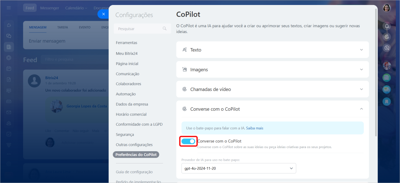 Atualmente, o CoPilot utiliza modelos de IA de provedores terceirizados, como a OpenAI. O Bitrix24 armazena seus dados por até 14 dias por motivos técnicos e, em seguida, os exclui. Para mais detalhes sobre como os provedores de IA processam dados, consulte a documentação deles.