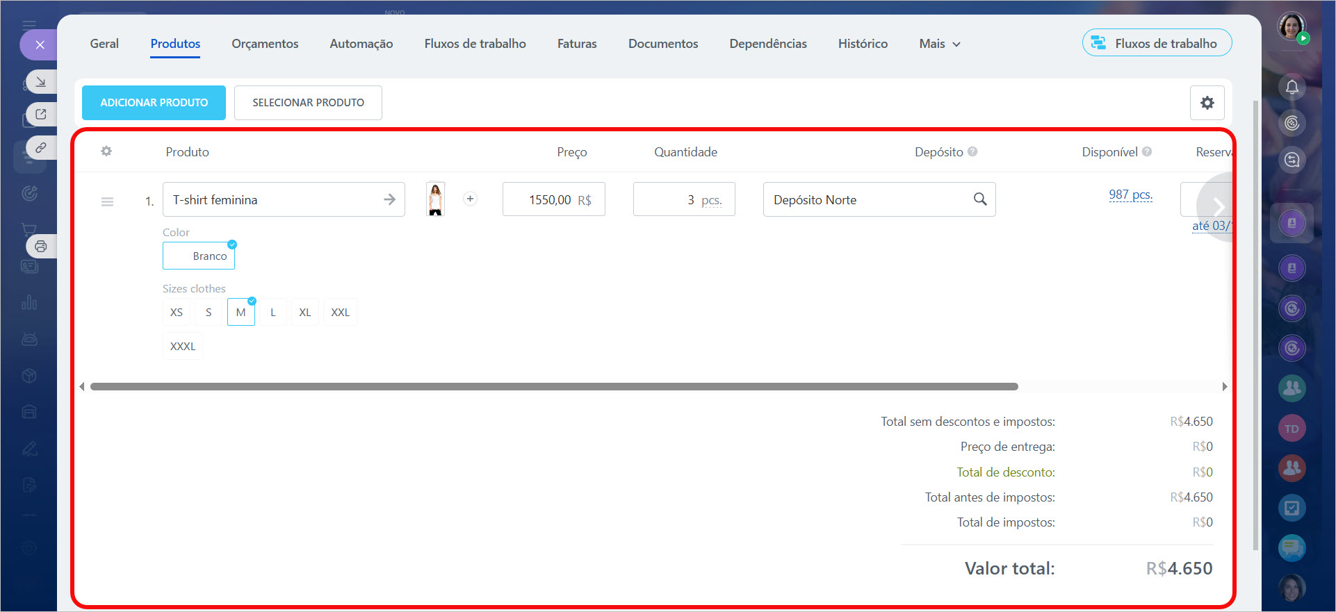 Como resultado, você receberá uma tabela com a quantidade de produtos vendidos, valores de impostos e descontos. Esses relatórios também podem ser gerados para leads.