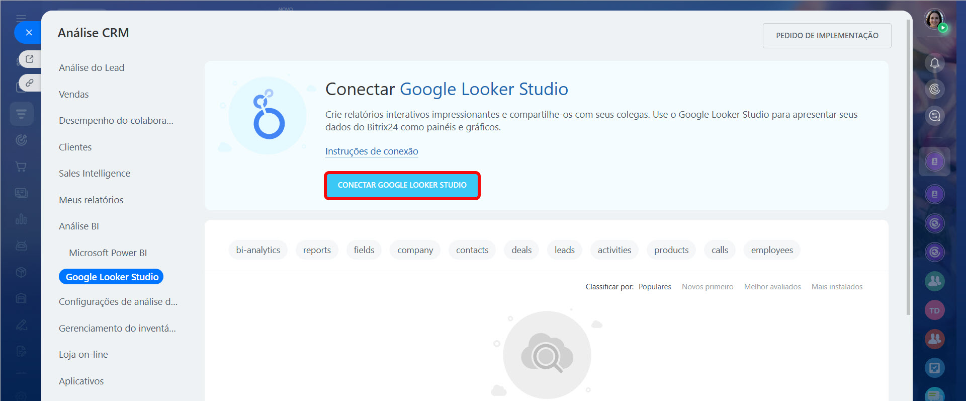 Vá para a seção CRM > Análises > Análise em tempo real > Análise BI e clique em Conectar Google Looker Studio.