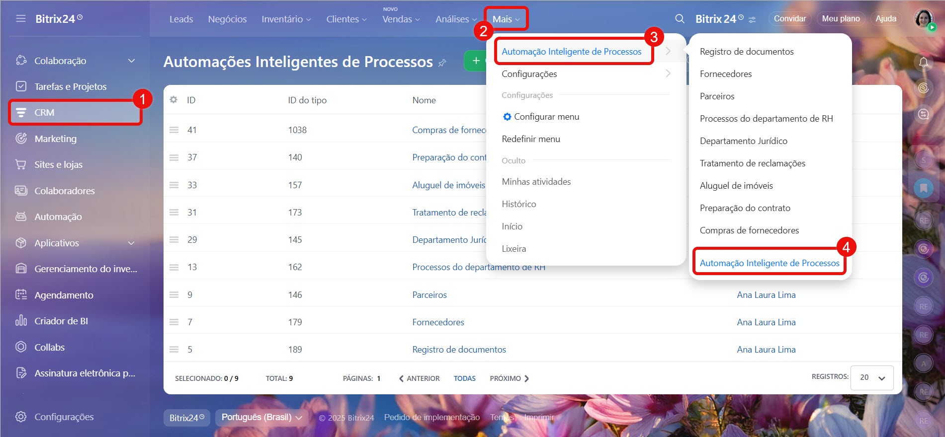Acesse a seção CRM > Mais > Automação inteligente de processos > Automação inteligente de processos.