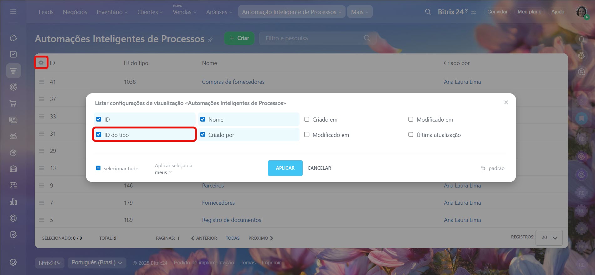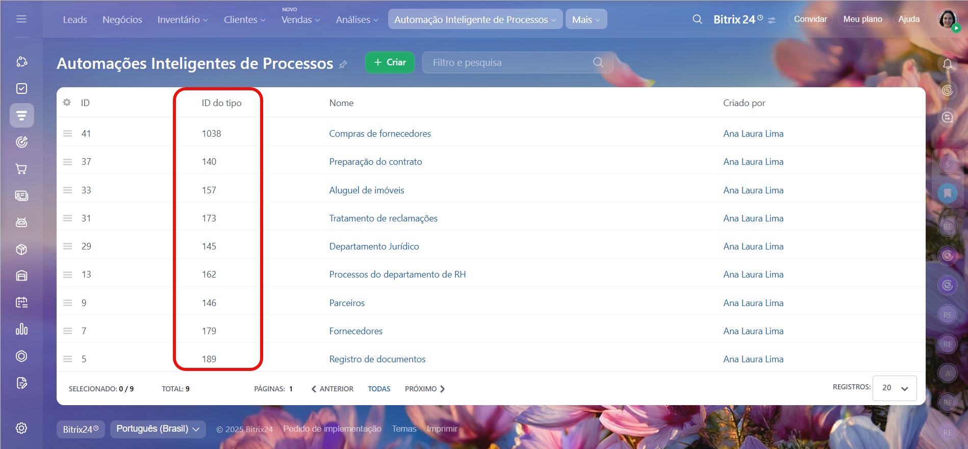 Na coluna você verá os IDs de cada processo inteligente. Anote aqueles que precisam ser adicionados ao relatório.