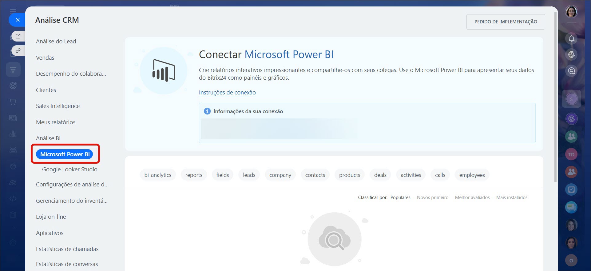 Acesse CRM > Análises > Análise em tempo real > Análise BI > Microsoft Power BI e instale o aplicativo Universal data source for BI analytics.